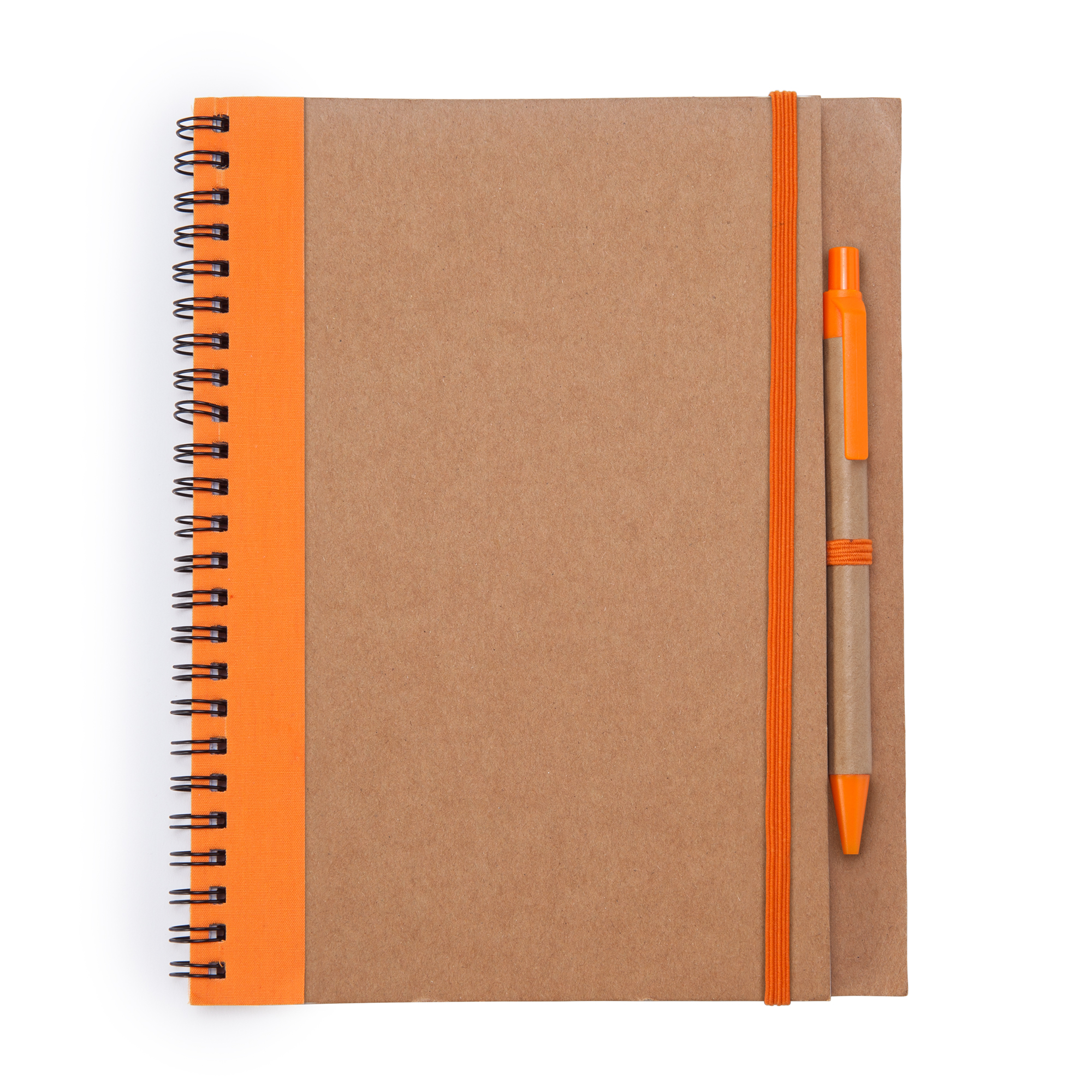 Libreta con espiral y tapa rígida de cartón reciclado. Incluye bolígrafo a juego con tinta azul. 60 hojas lisas.