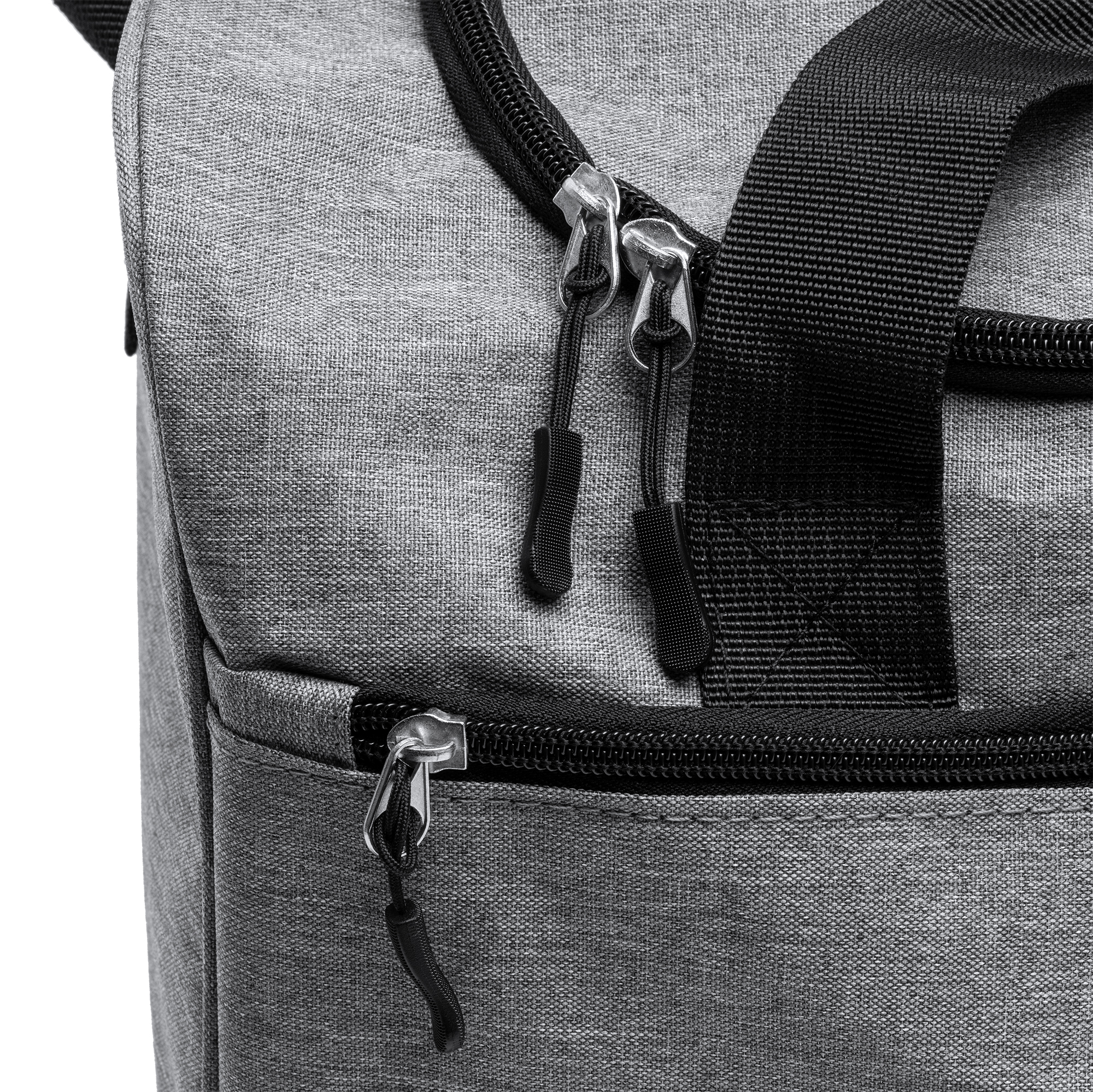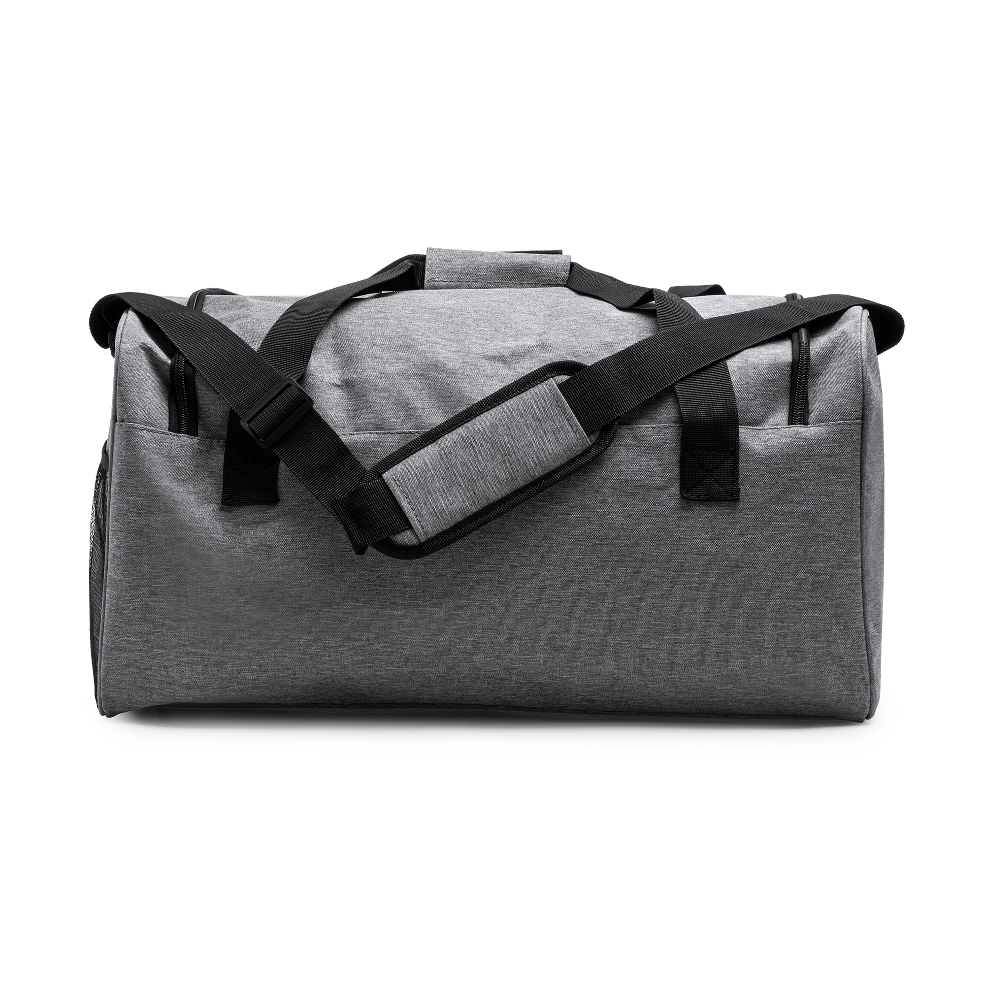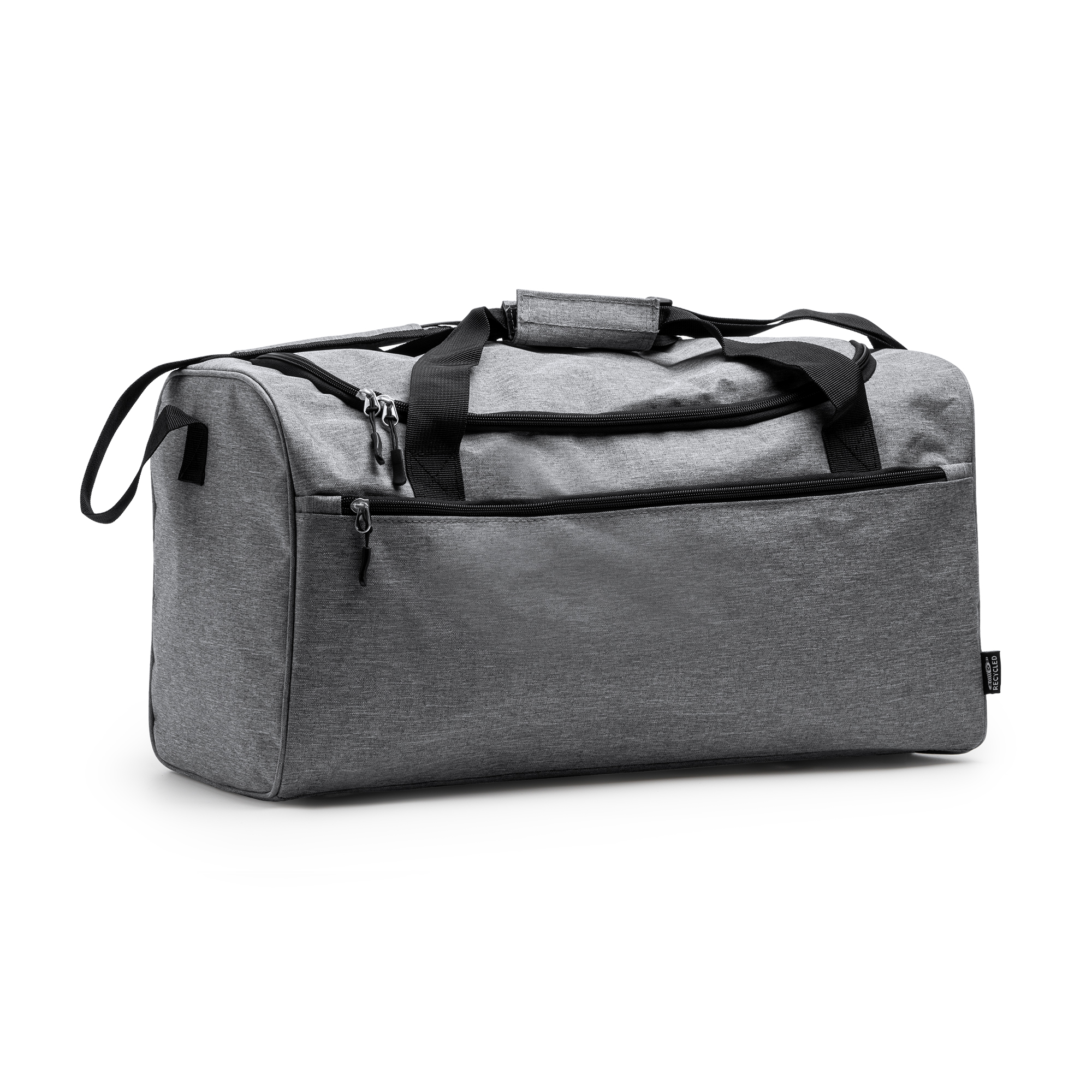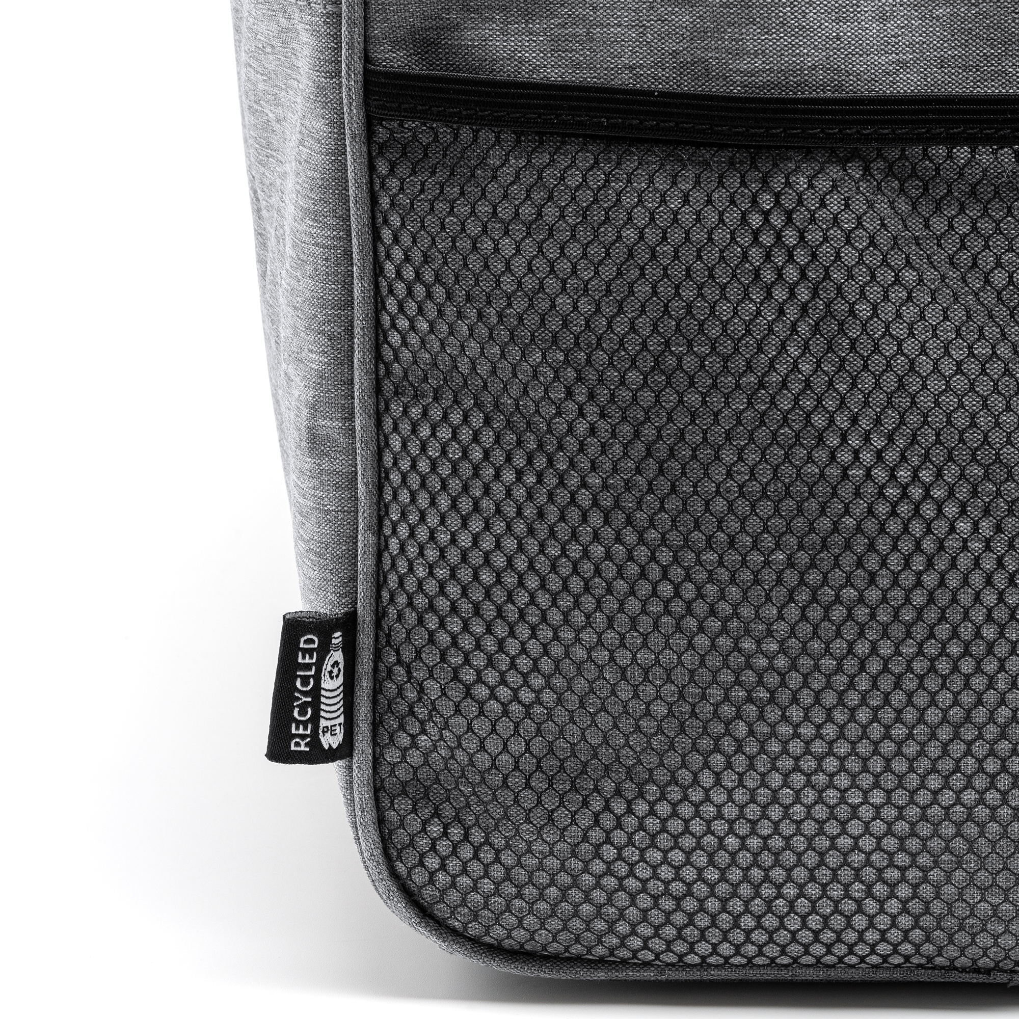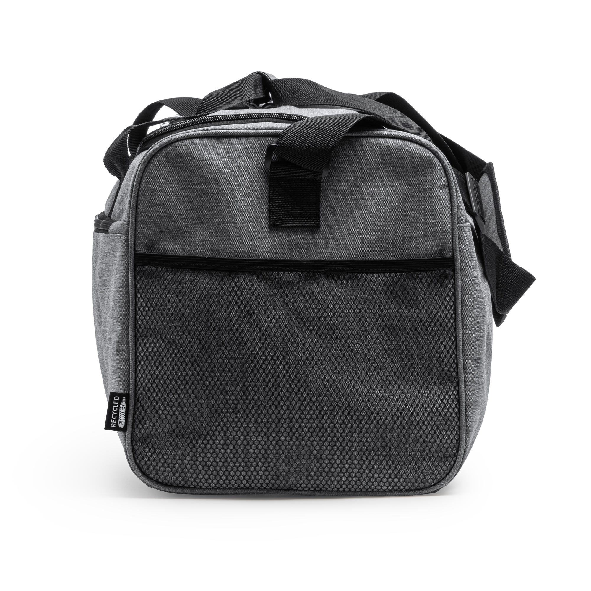 Bolso multifunción realizado en RPET 300D de diseño vigoré. Capacidad 30L. Bolsillo principal y frontal con cierre de cremallera. Bolsillo lateral de rejilla. Incluye cinta bandolera ajustable.