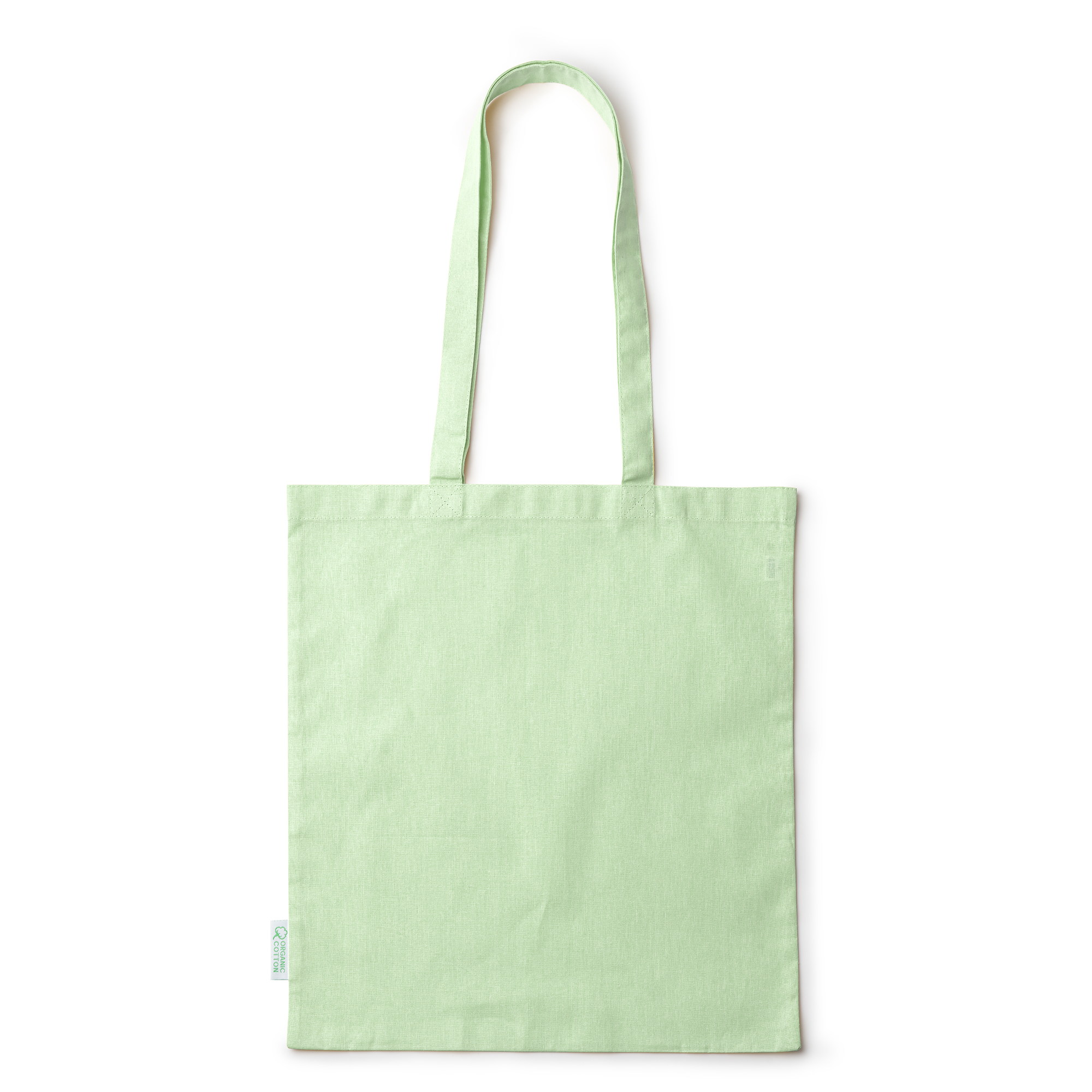 Bolsa 100% algodón orgánico de 140 g/m² con asas reforzadas largas de 70 cm.