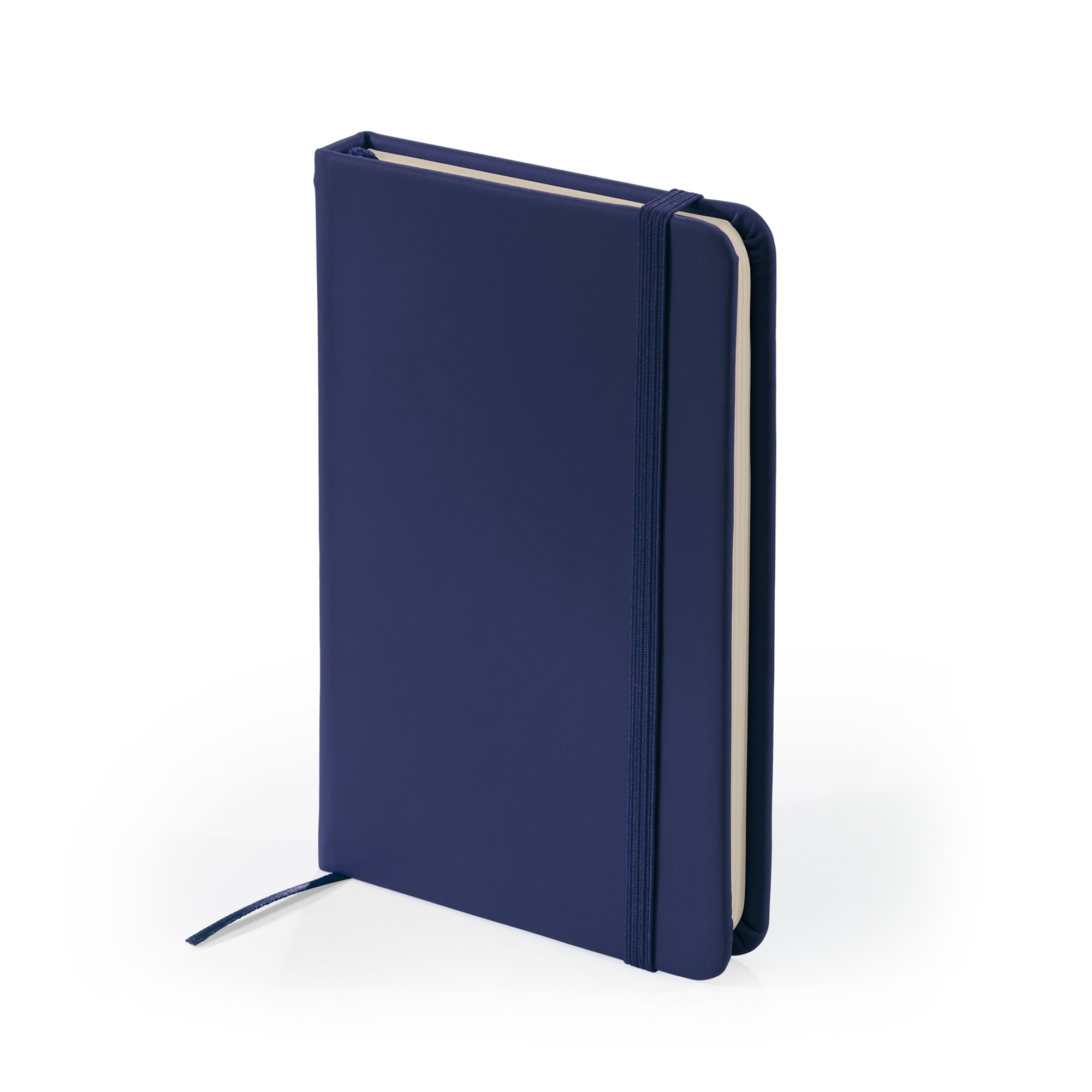 Bloc de notas A6 con tapa rígida de polipiel. Marcapáginas y banda elástica. 100 hojas lisas.