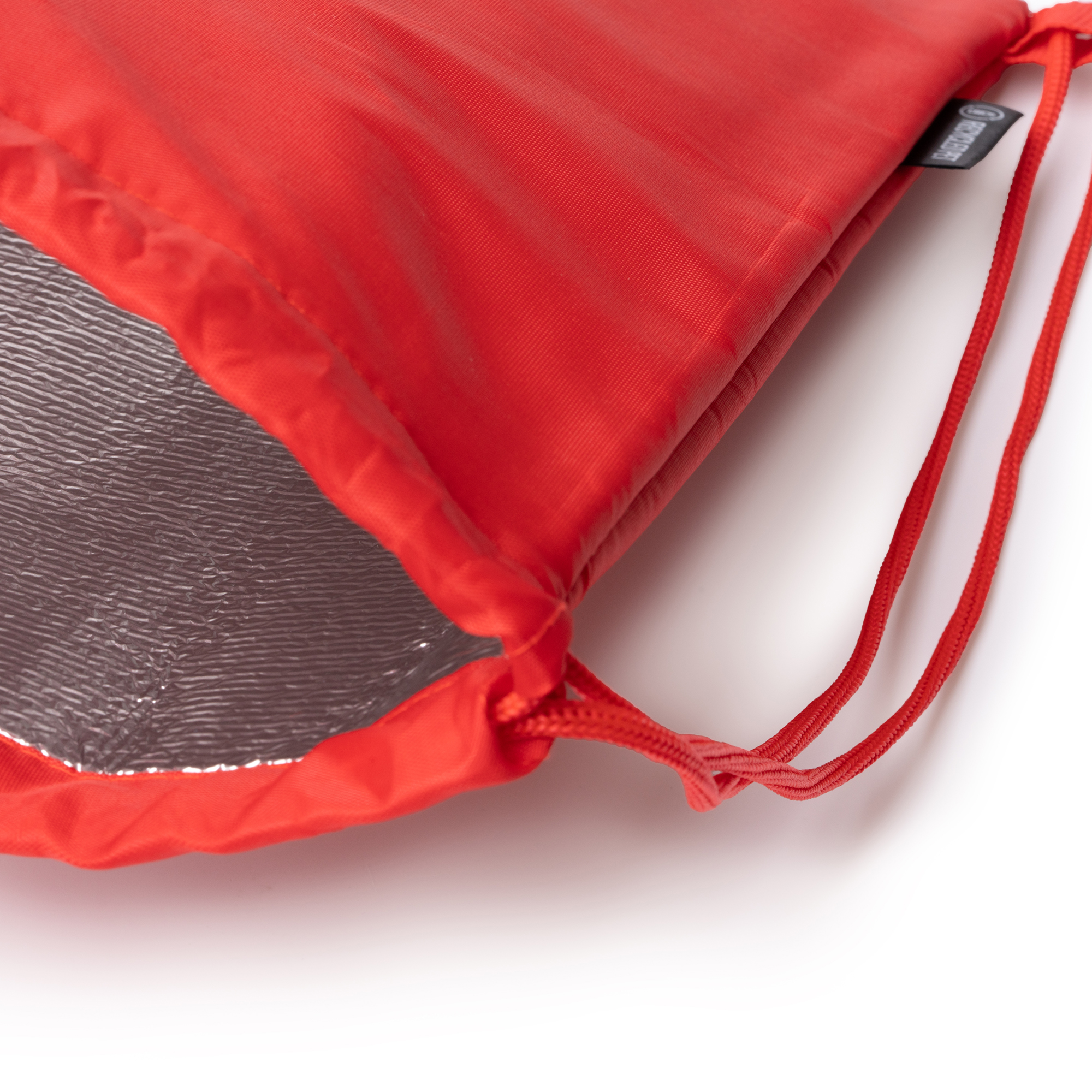 Mochila nevera para niños con diseño de cuerdas ajustables. Con interior isotérmico de aluminio y exterior elaborado en poliéster reciclado 210D. Una opción perfecta para que los más pequeños puedan transportar sus bebidas a la temperatura óptima.