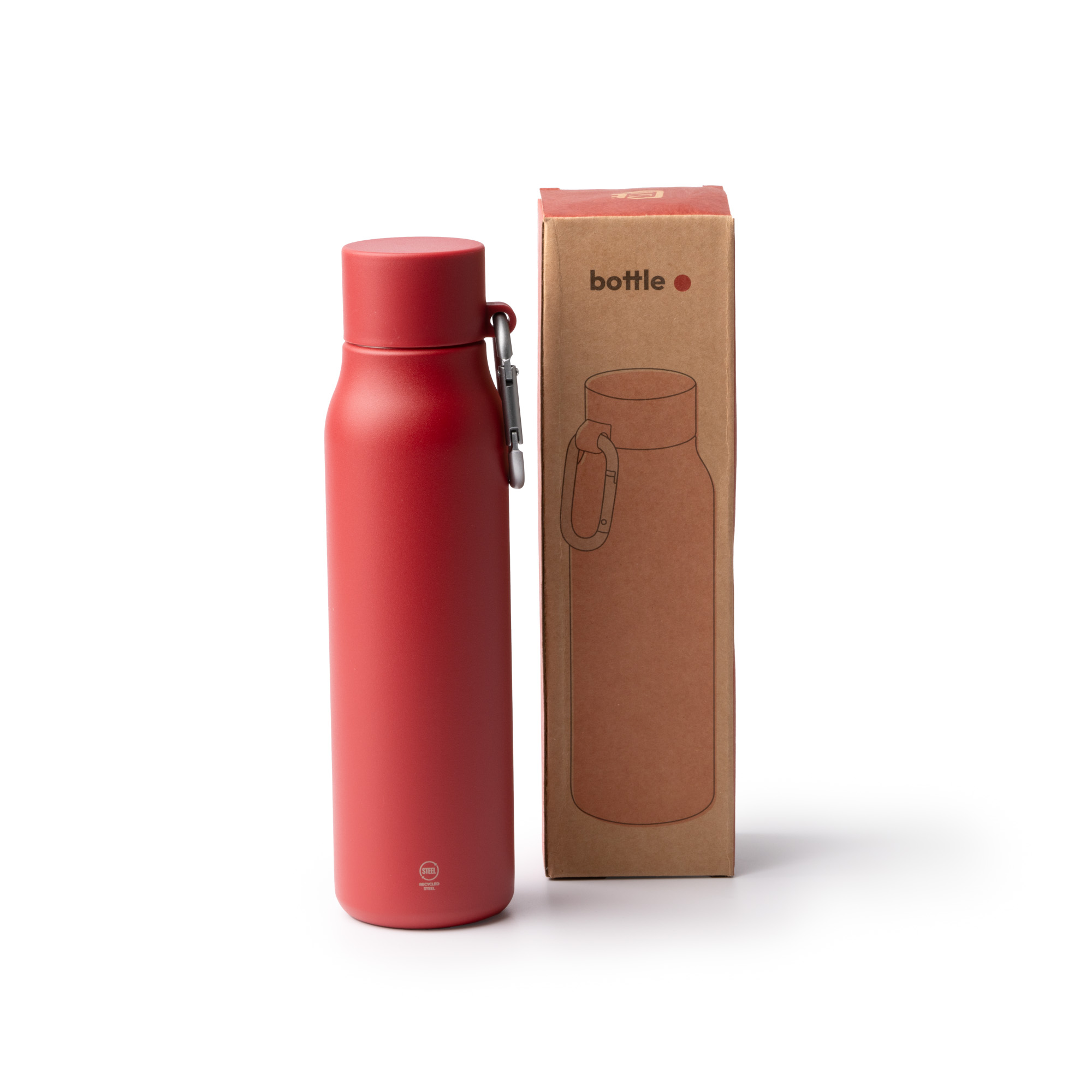 Bidón térmico de doble pared elaborado en acero inoxidable 304 reciclado en acabado mate. Capacidad de 550 ml. Tapón a juego. Incluye mosquetón para transporte.