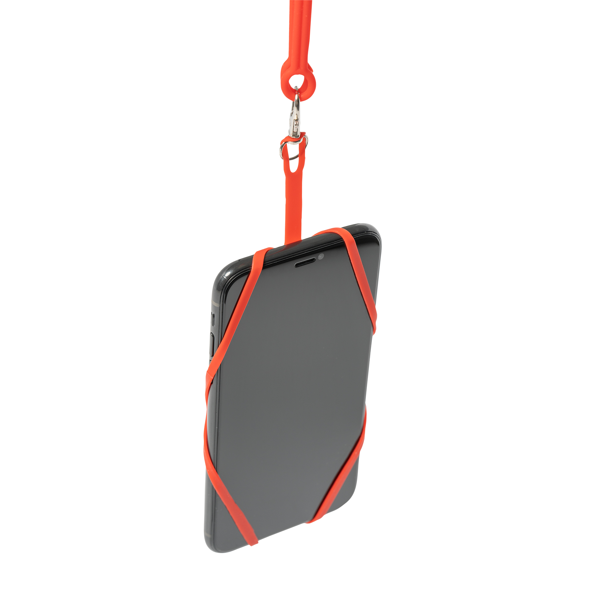 Lanyard de silicona con soporte para móvil y tarjetas. Con sistema de ajuste y mosquetón.