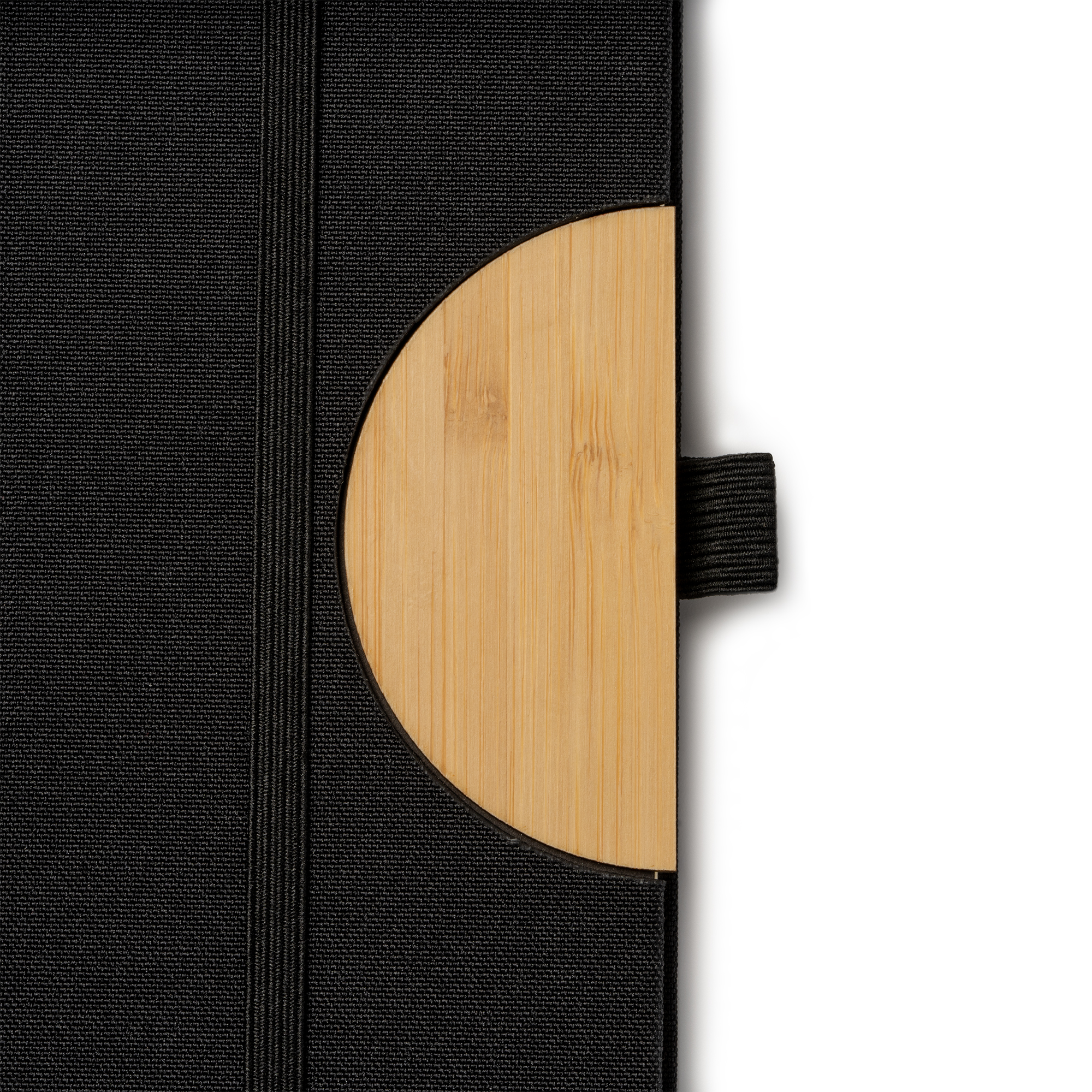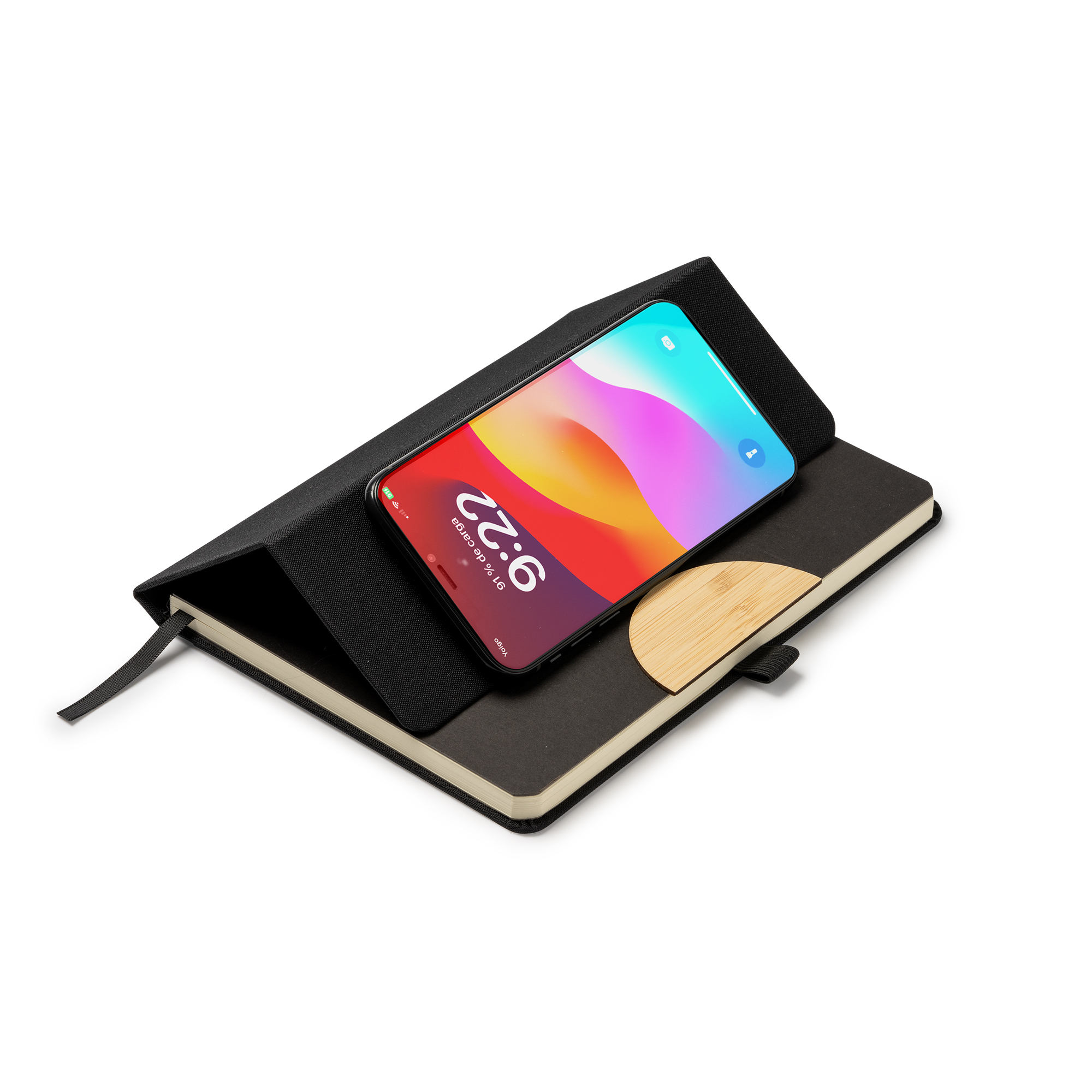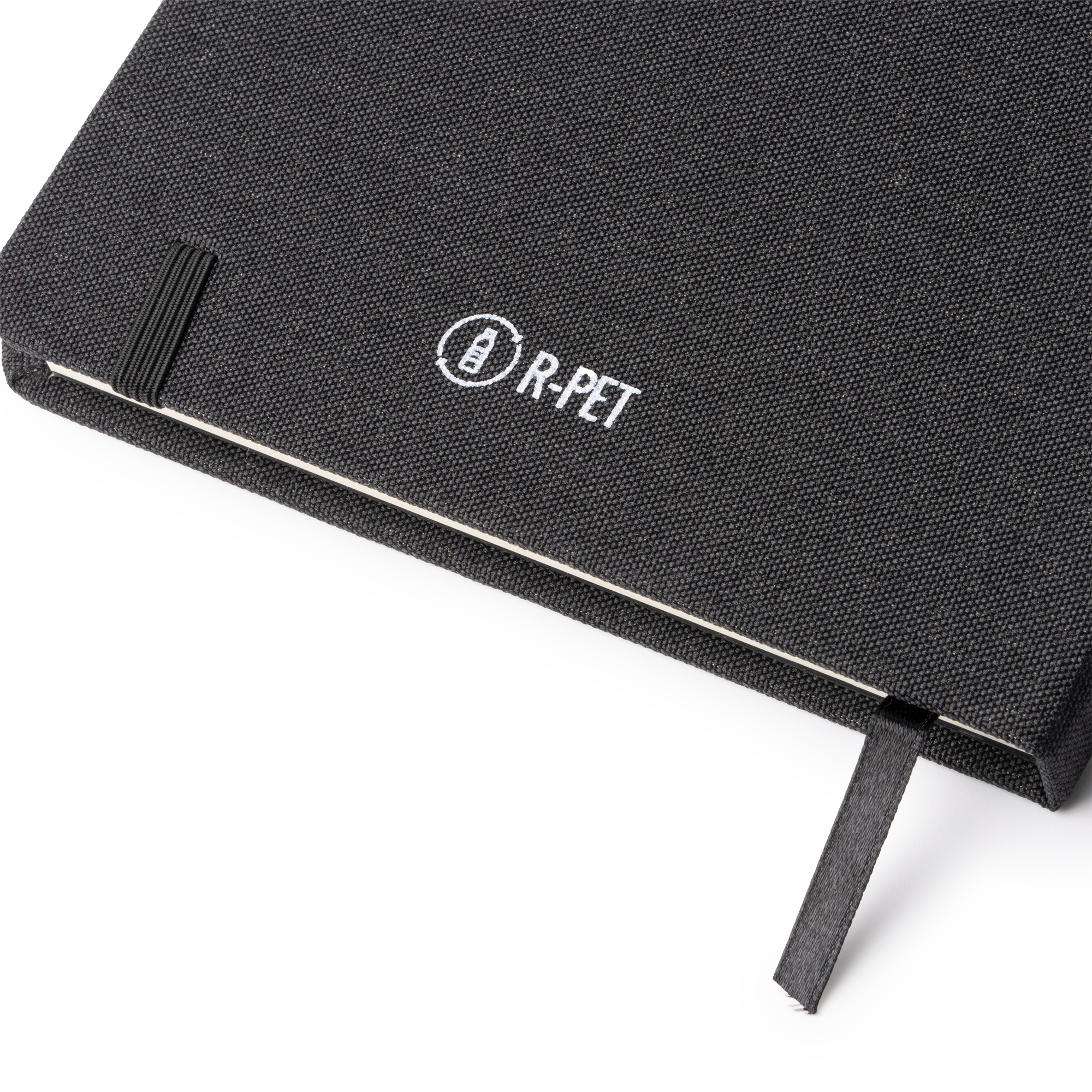 Bloc de notas A5 con tapa rígida de RPET con función soporte para dispositivos. Banda elástica de cierre, marcapáginas y soporte para bolígrafo. Este bloc cuenta con 80 hojas lisas.