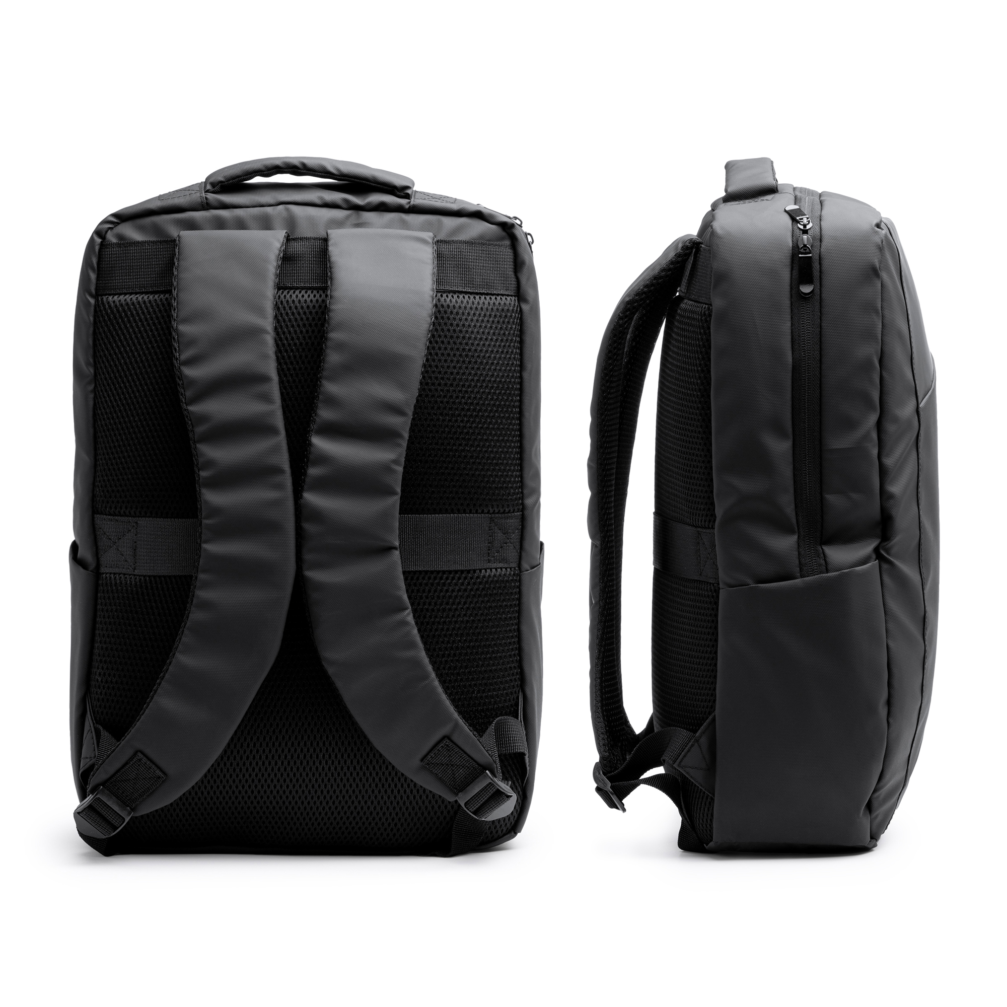 Mochila ejecutiva de PU Leather con cuerpo y asas acolchadas. En el interior cuenta bolsillo interior acolchados optimizados para el transporte de ordenador portátil de 13″ o tablet. Además, cuenta con un bolsillo exterior con cremallera impermeable y una banda reflectante. Con un doble compartimento y bolsillos laterales, especialmente pensados para el transporte de botellas. También cuenta con una cinta para trolley, facilitando el transporte en combinación con una maleta con ruedas.