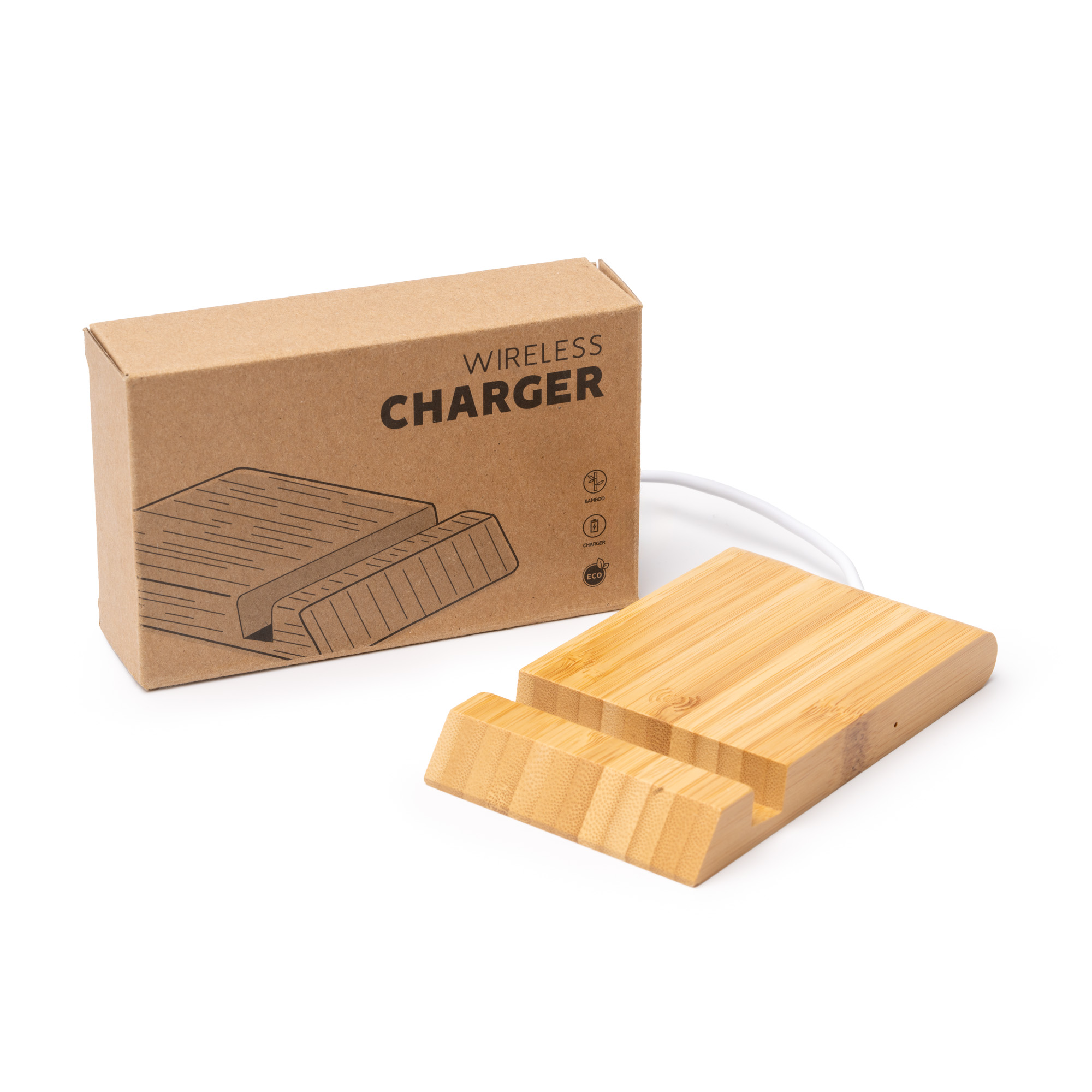 Cargador inalámbrico elaborado en bambú con soporte para móvil y Tablet. Con 5W de potencia e indicador luminoso de confirmación de carga. Cable USB de conexión incorporado.