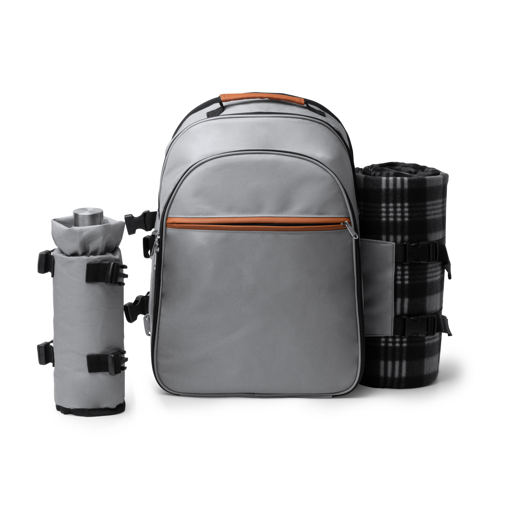 Mochila picnic realizada en políester reciclado RPET. Compartimento principal con diferentes complementos: 2 tazas, 2 platos, 2 set de cubiertos, 1 salero, 1 pimentero, 1 sacacorchos y 1 tabla de contar. Compartimento lateral para manta de picnic (incluida) y compartimento lateral para botellas.