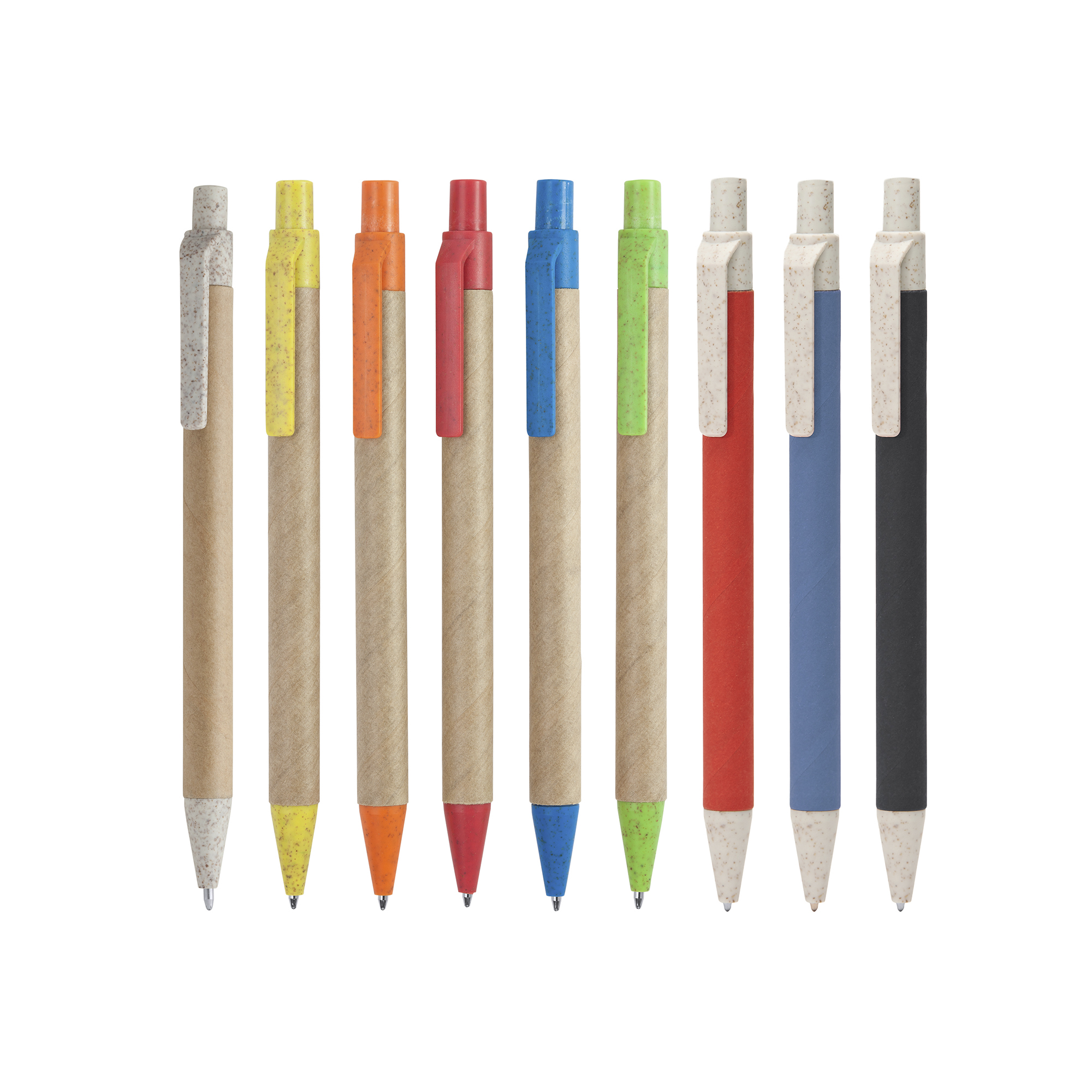 Bolígrafo pulsador hecho en cartón reciclado, con la punta y el clip en fibra de trigo y ABS.
