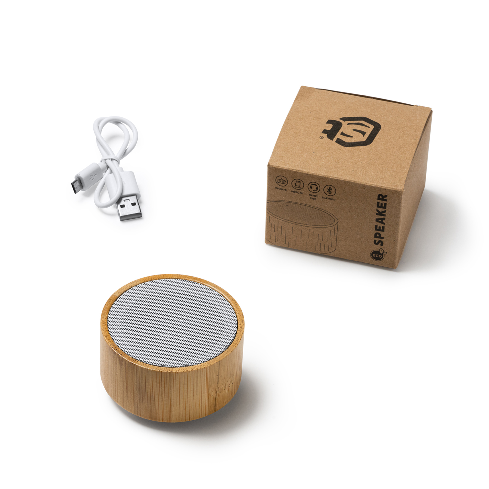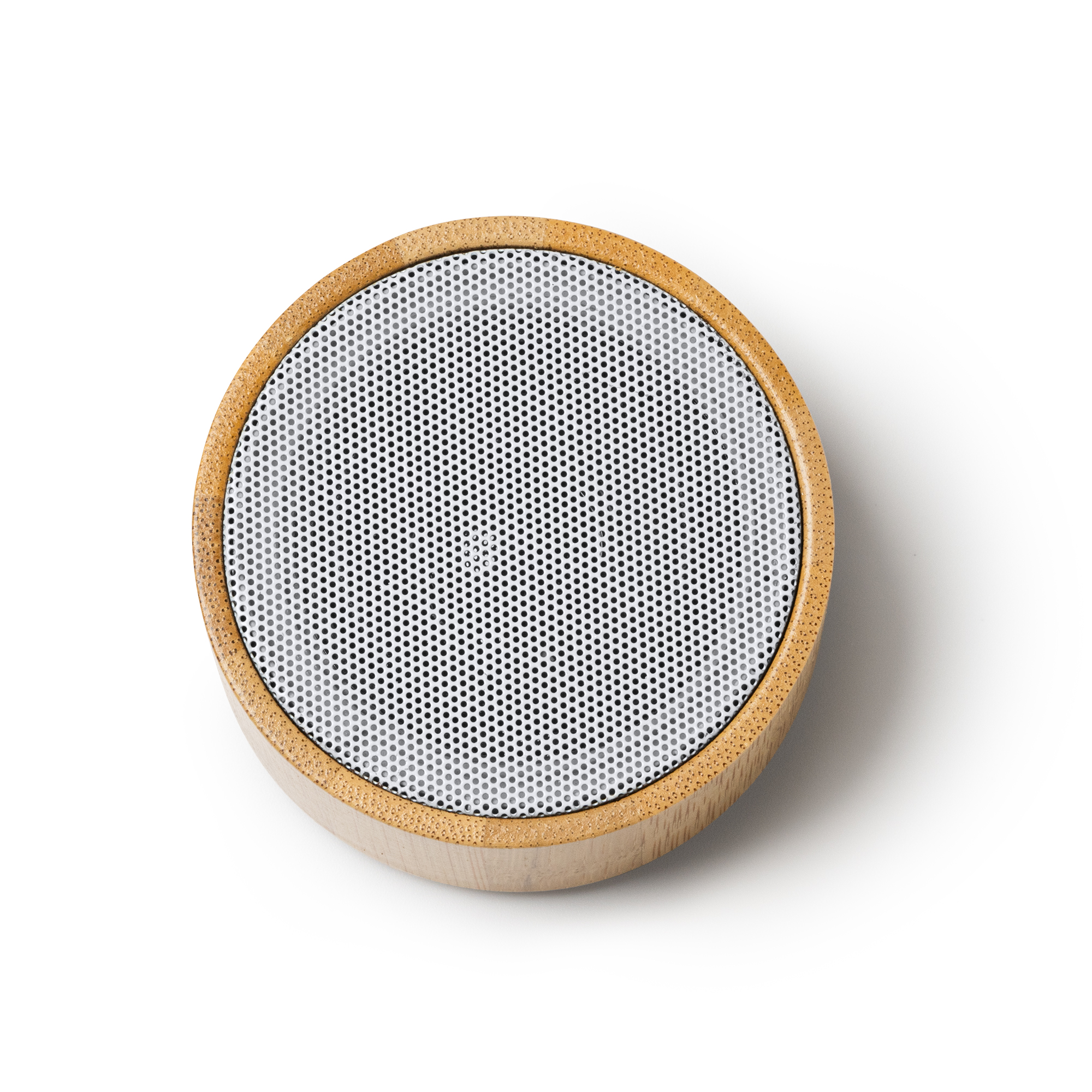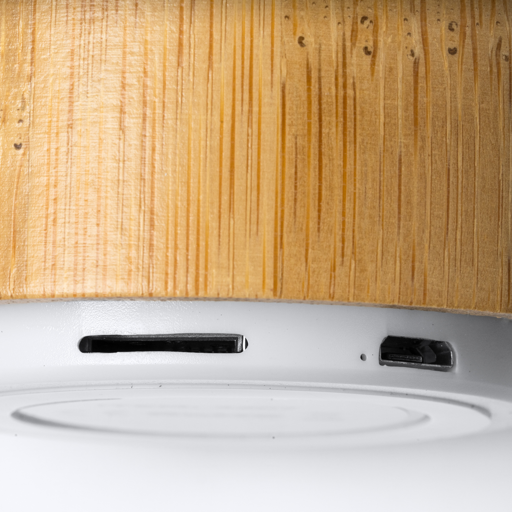 Añadir al rastreador de preciosAltavoz inalámbrico redondo con cuerpo elaborado en ABS y bambú. Con base antideslizante y rejilla en color blanco. Con batería recargable y potencia de 3W. Tiempo máximo de reproducción de hasta 4 horas. Con función manos libres y micrófono para realizar llamadas. Reproducción de audio Bluetooth, Radio FM y mediante tarjeta MicroSD. Incluye botones en la parte trasera para control de reproducción de audio y llamadas.