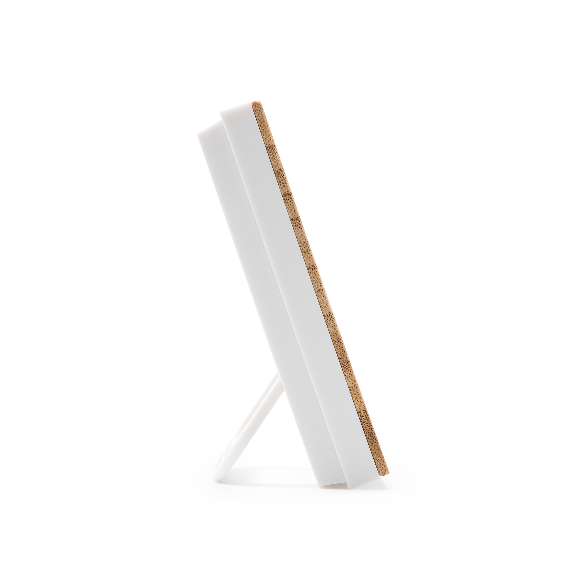 Estación meteorológica con carcasa frontal de bambú. Función reloj, calendario y alarma con sensores de temperatura y humedad. Registro de temperatura y humedad máxima y mínima.