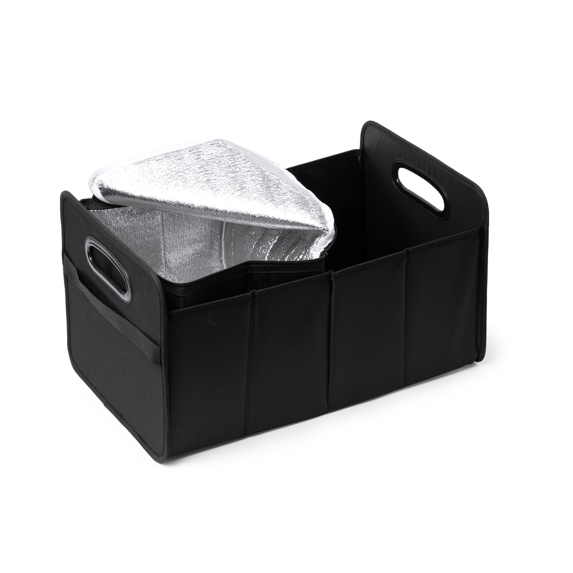 Organizador de maletero plegable con asas reforzadas. Realizado en poliéster 600D. 2 compartimentos principales y bolsillo exterior. Incluye nevera extraíble de 12L con interior isotérmico.