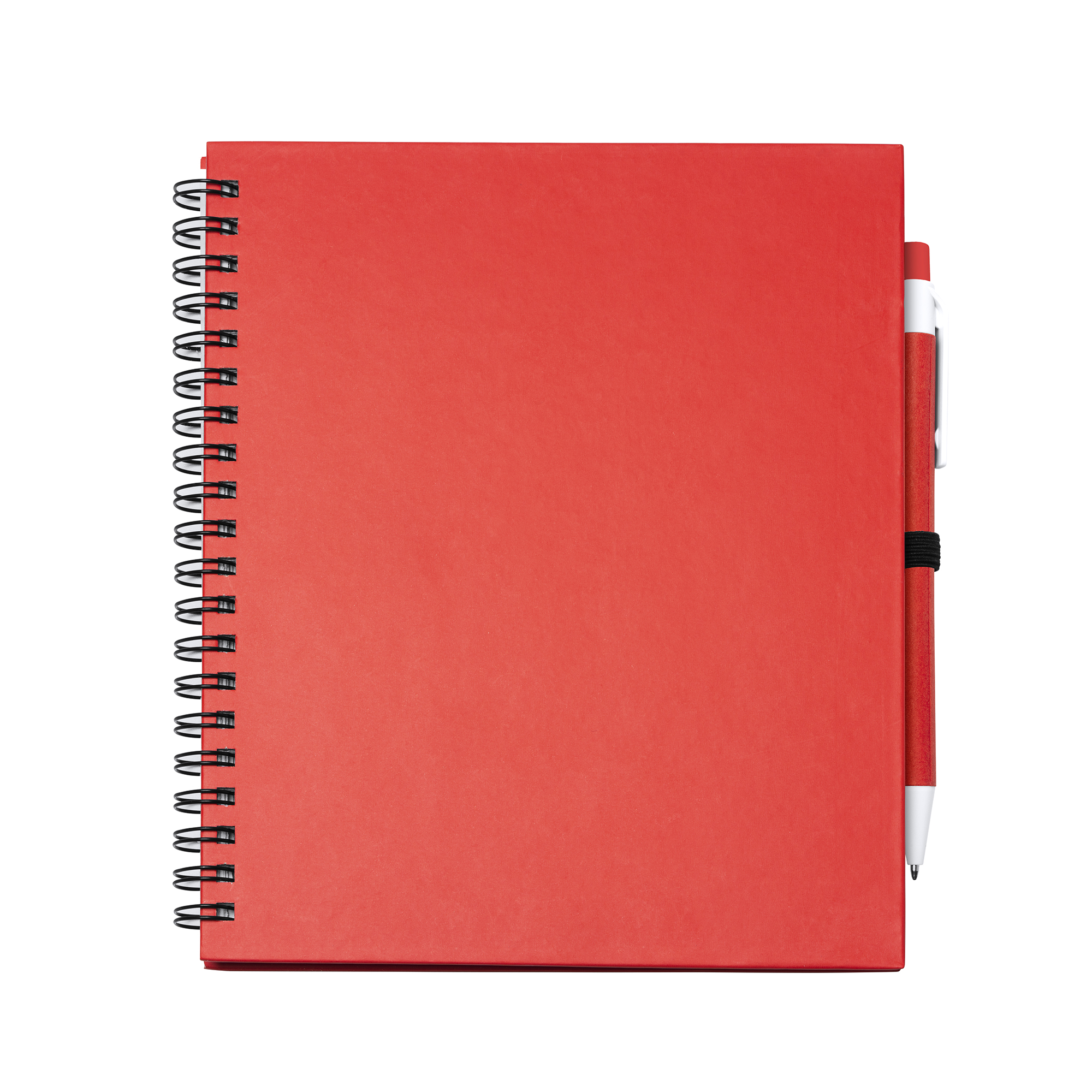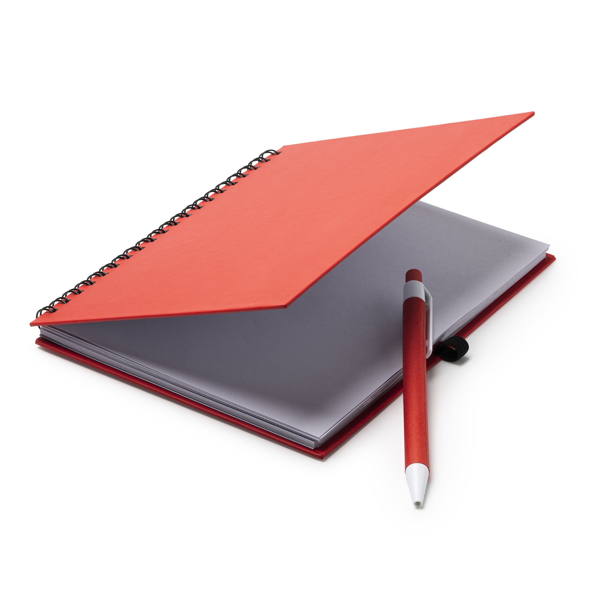 Libreta con espiral, compuesta por 70 hojas de papel liso y soporte para bolígrafo. Tapas rígidas y bolígrafo de cartón reciclado a juego.