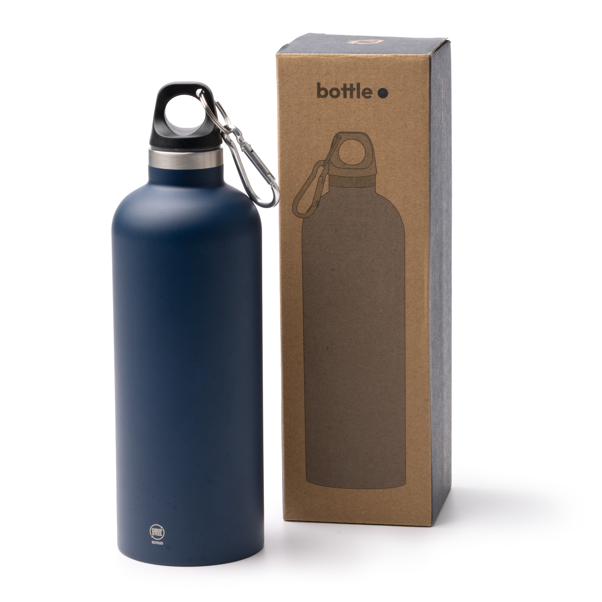 Bidón elaborado en acero inoxidable 304 reciclado con doble pared. Tapón antigoteo. Capacidad para 500 ml. Cuenta con mosquetón para transporte.