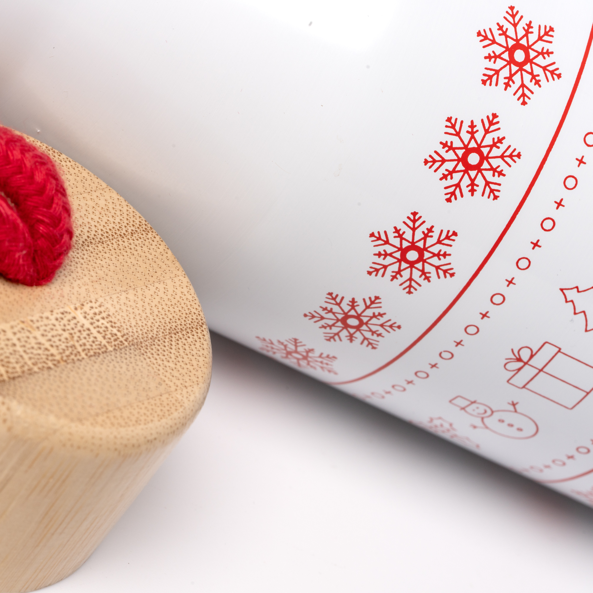 El bidón de acero inoxidable de doble pared presenta una tapa de bambú y un diseño navideño alrededor del cuerpo. Con asa de transporte de algodón y capacidad de 500 ml, es ideal para mantener las bebidas frías o calientes.