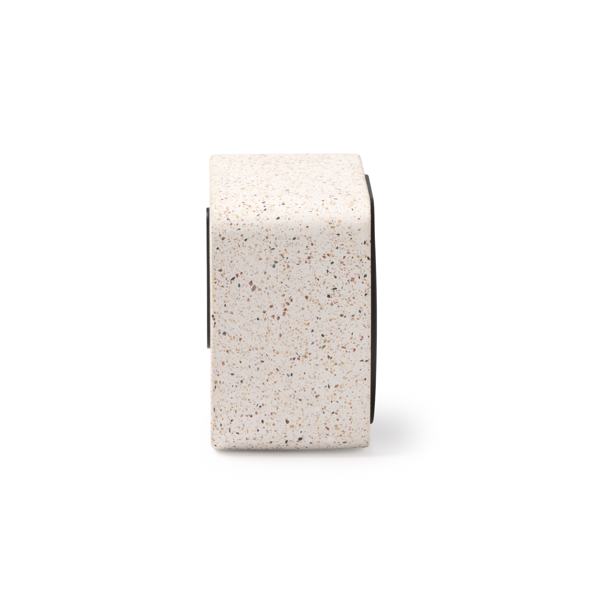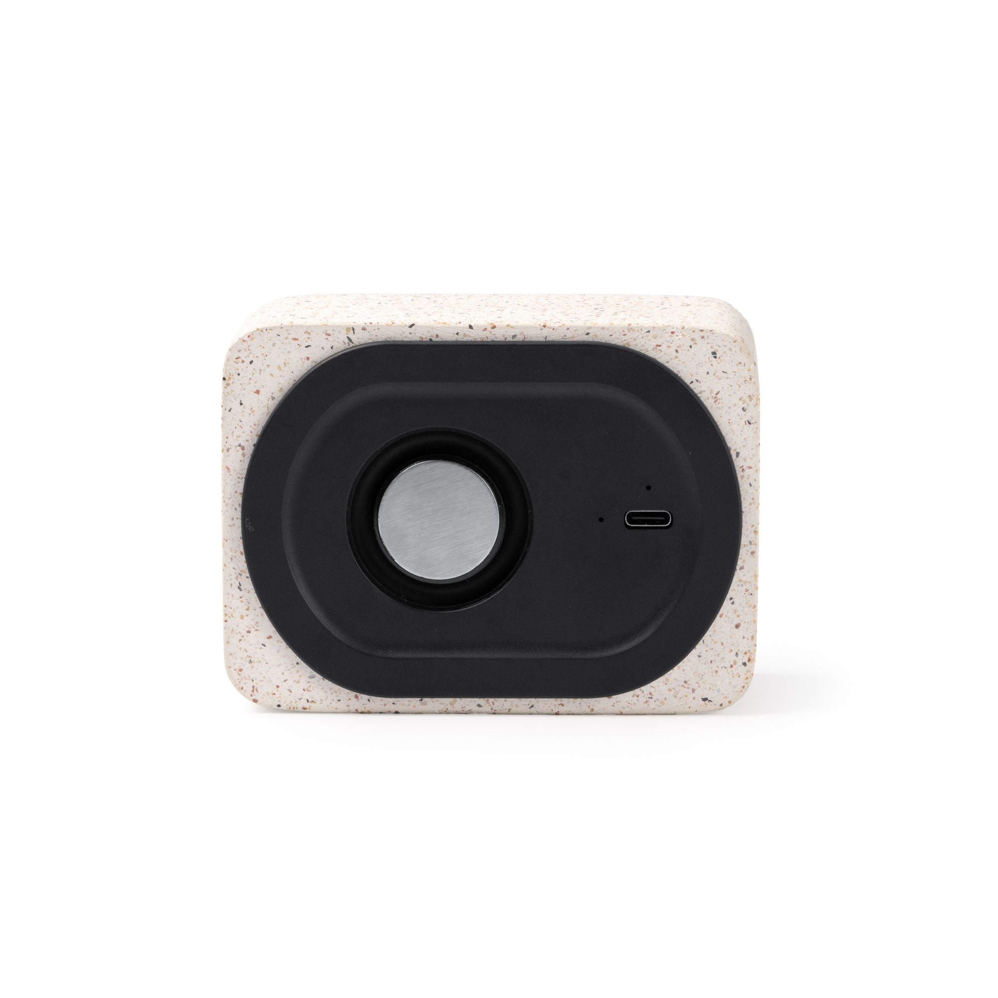Altavoz inalámbrico con potencia 5W, cuerpo realizado en piedra de terrazo reciclado y bambú, y conexión Bluetooth. Con batería de 500mAH recargable.