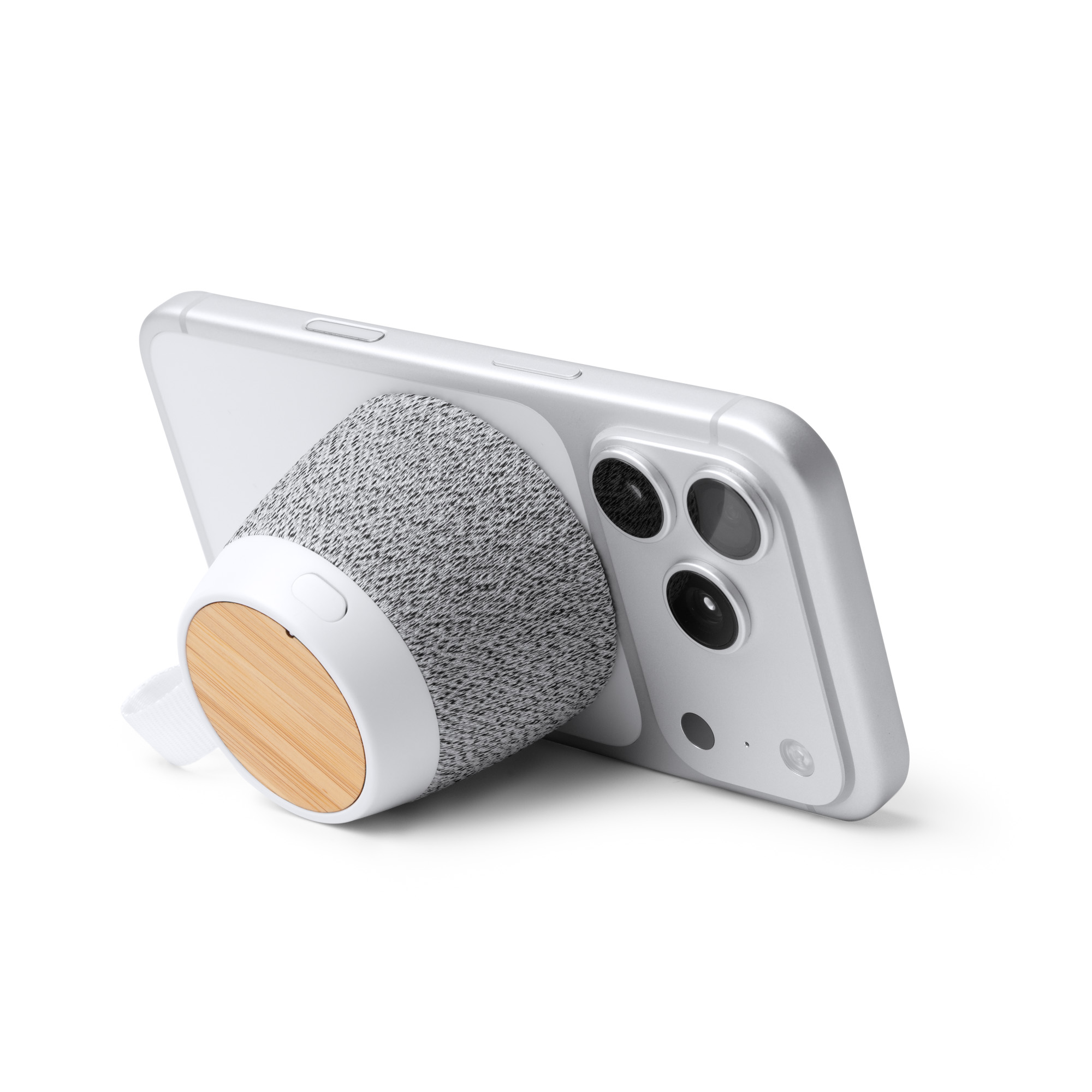 Añadir al rastreador de preciosAltavoz inalámbrico con cuerpo elaborado en bambú y tejido en RPET con potencia 5W y con batería con capacidad 300mAh. Cuenta con salida de audio mediante conexión Bluetooth y manos libres, además incluye un anillo magnético que lo convierte en soporte para smartphone haciéndolo más versátil en su uso. Incorpora un asa de transporte.