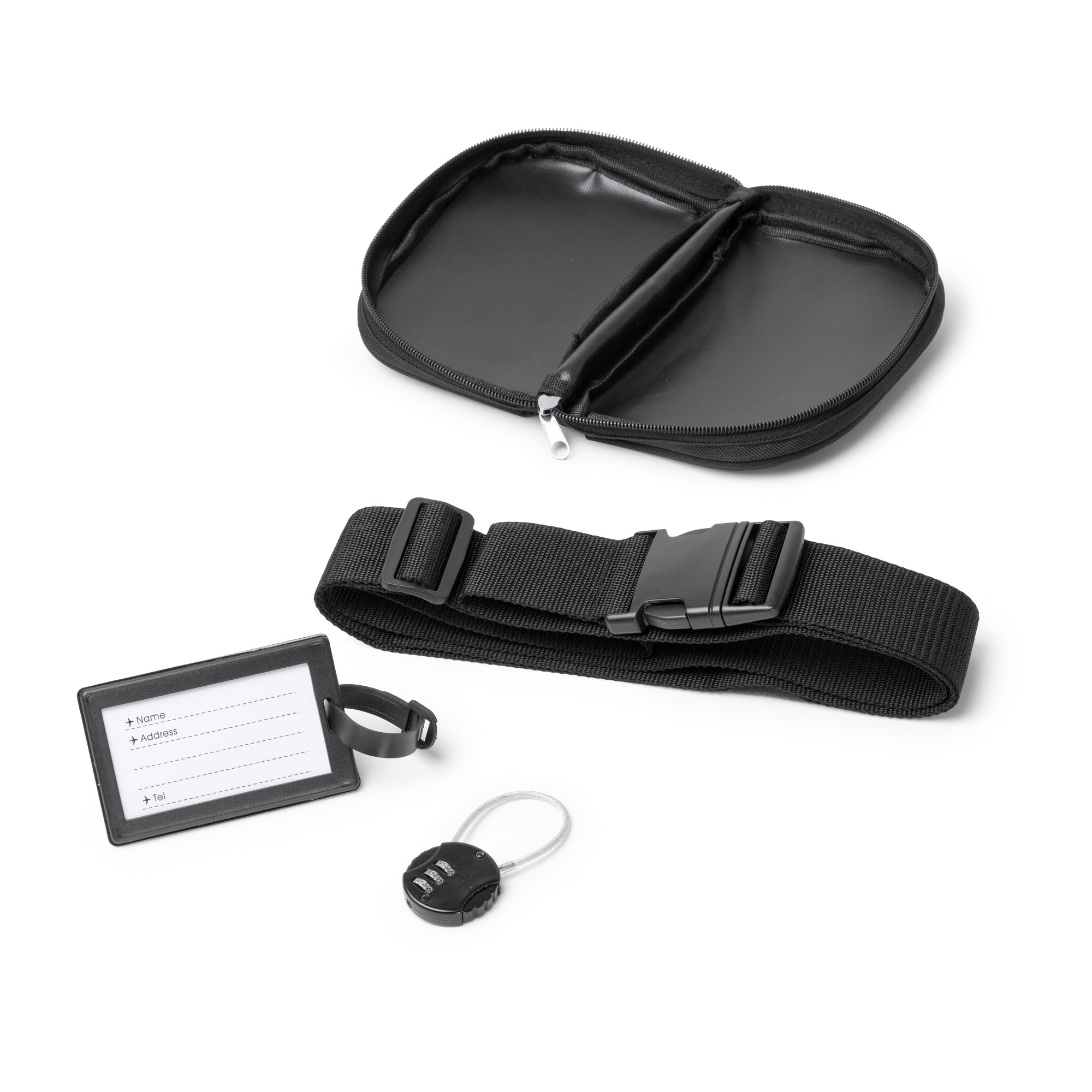 Set de viaje 3 en 1. Incluye candado con contraseña numérica de tres dígitos, tarjeta identificadora elaborada en PP y una cinta ajustable para maleta para dotarla de mayor seguridad. Todos estos accesorios se presentan en una funda elaborada en RPET con cierre de cremallera con apertura completa del mismo.