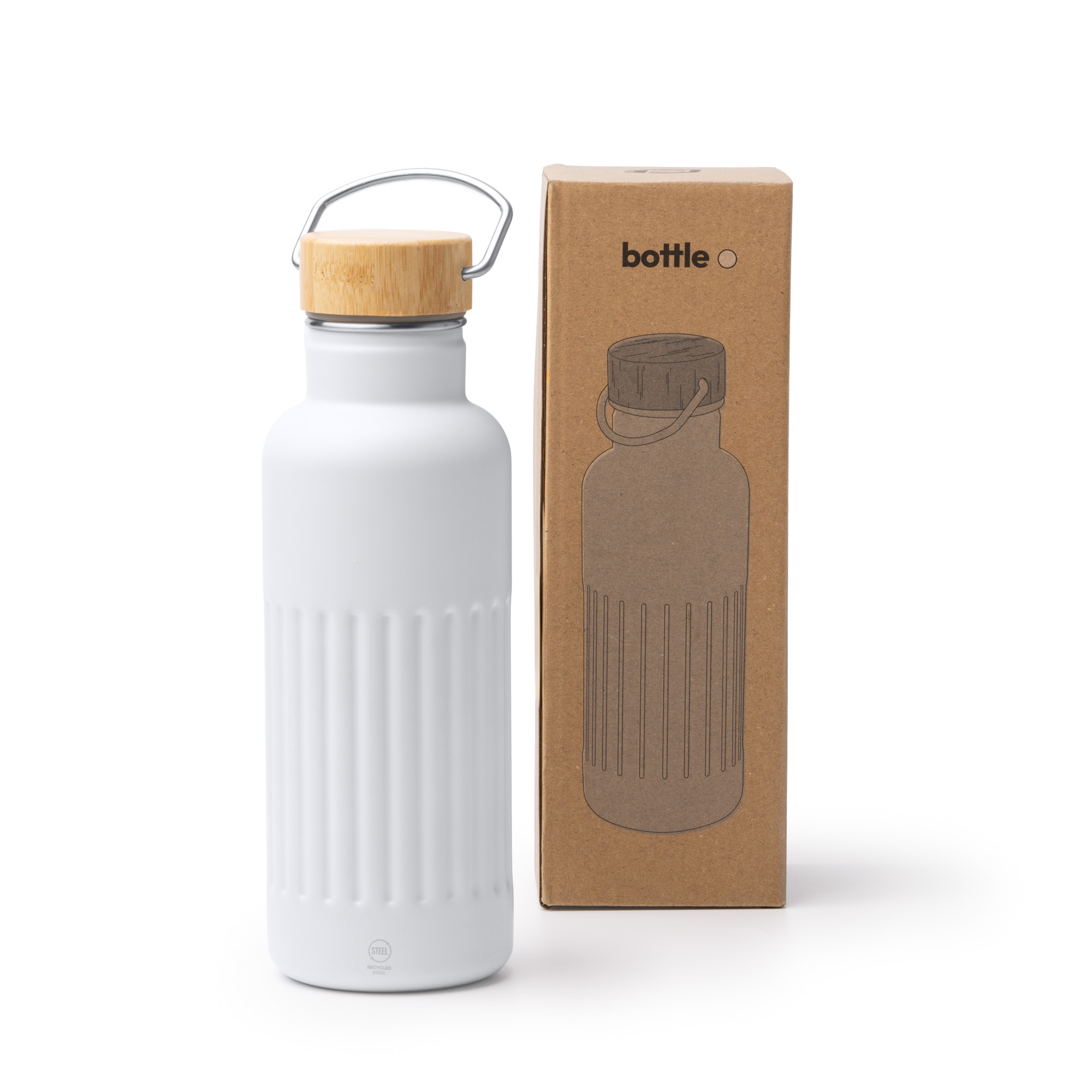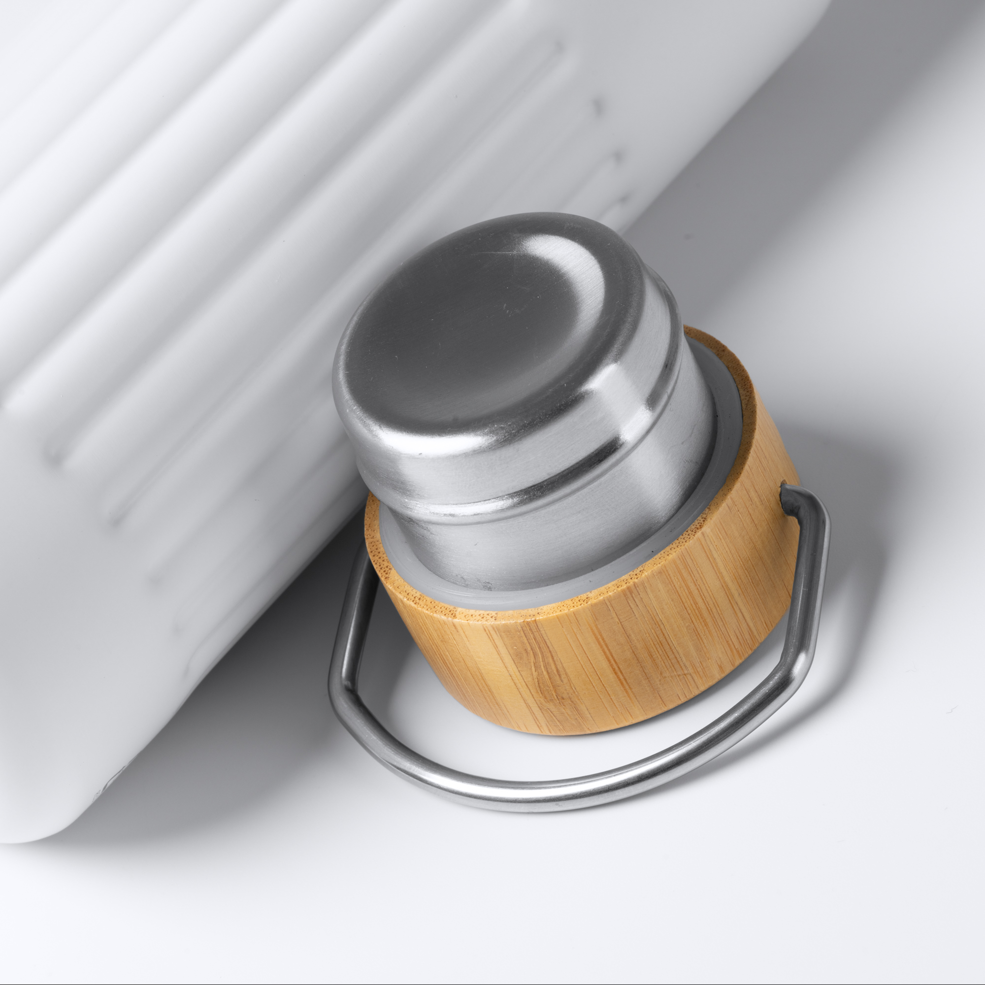 Bidón térmico de acero inoxidable 304 reciclado con diseño biselado de doble pared y tapa de bambú. Capacidad 500 ml.