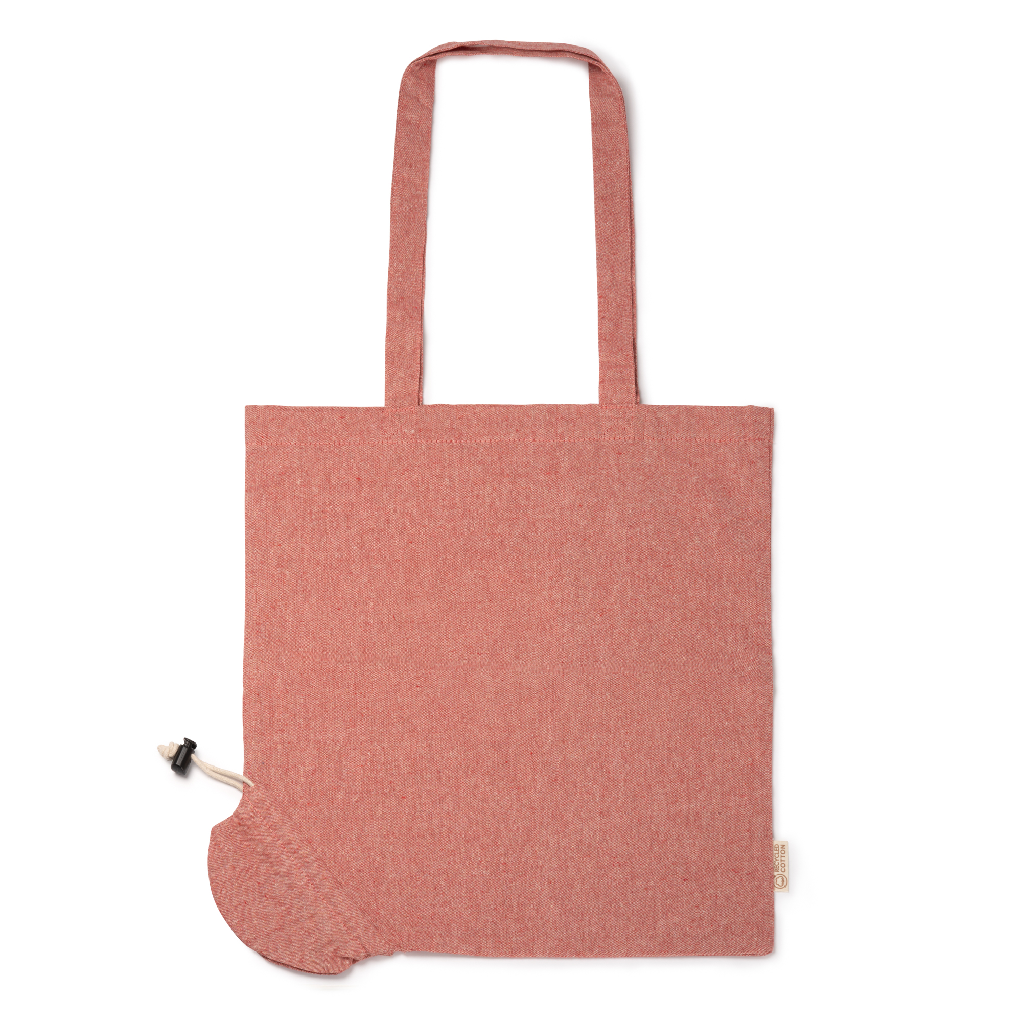 Bolsa plegable de algodón reciclado de 120 g/m² a color, con asas largas de 70 cm. Incorporado incluye un cordón que permite que la bolsa se pliegue desde la esquina inferior y conseguir mayor versatilidad. Esta bolsa es una opción práctica, sostenible y versátil para el transporte de tus objetos personales.