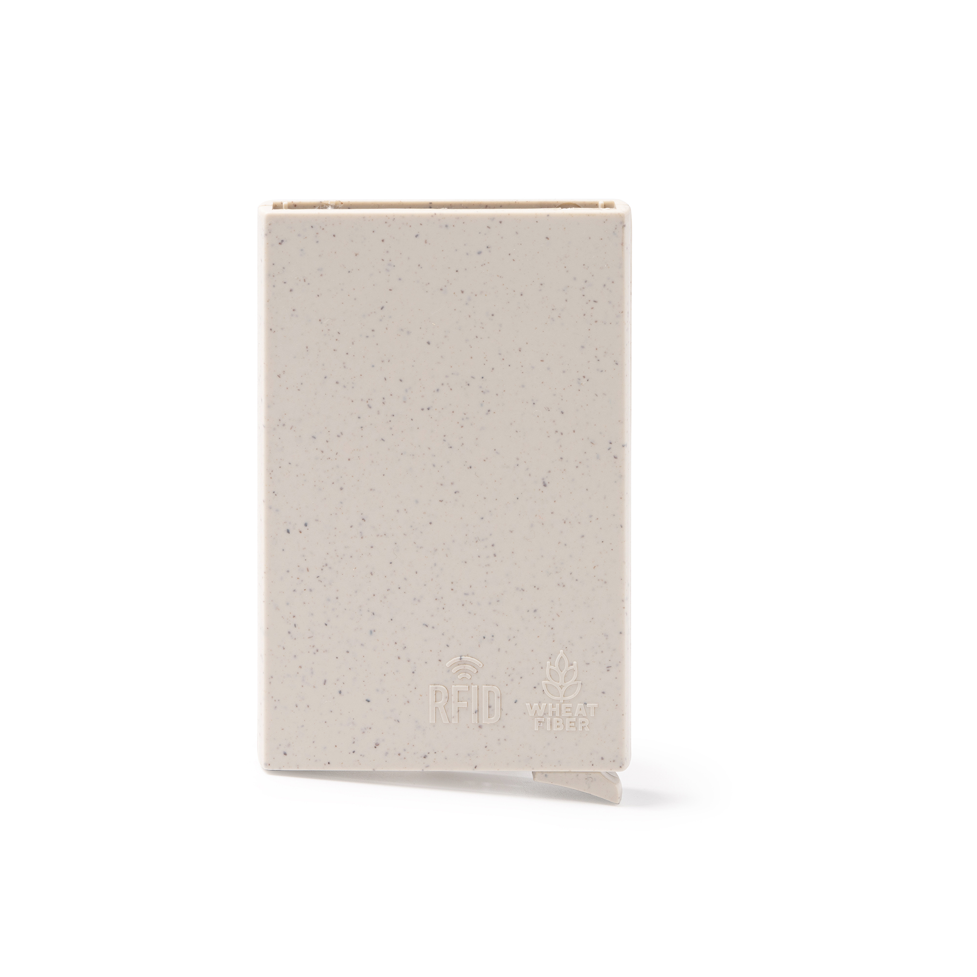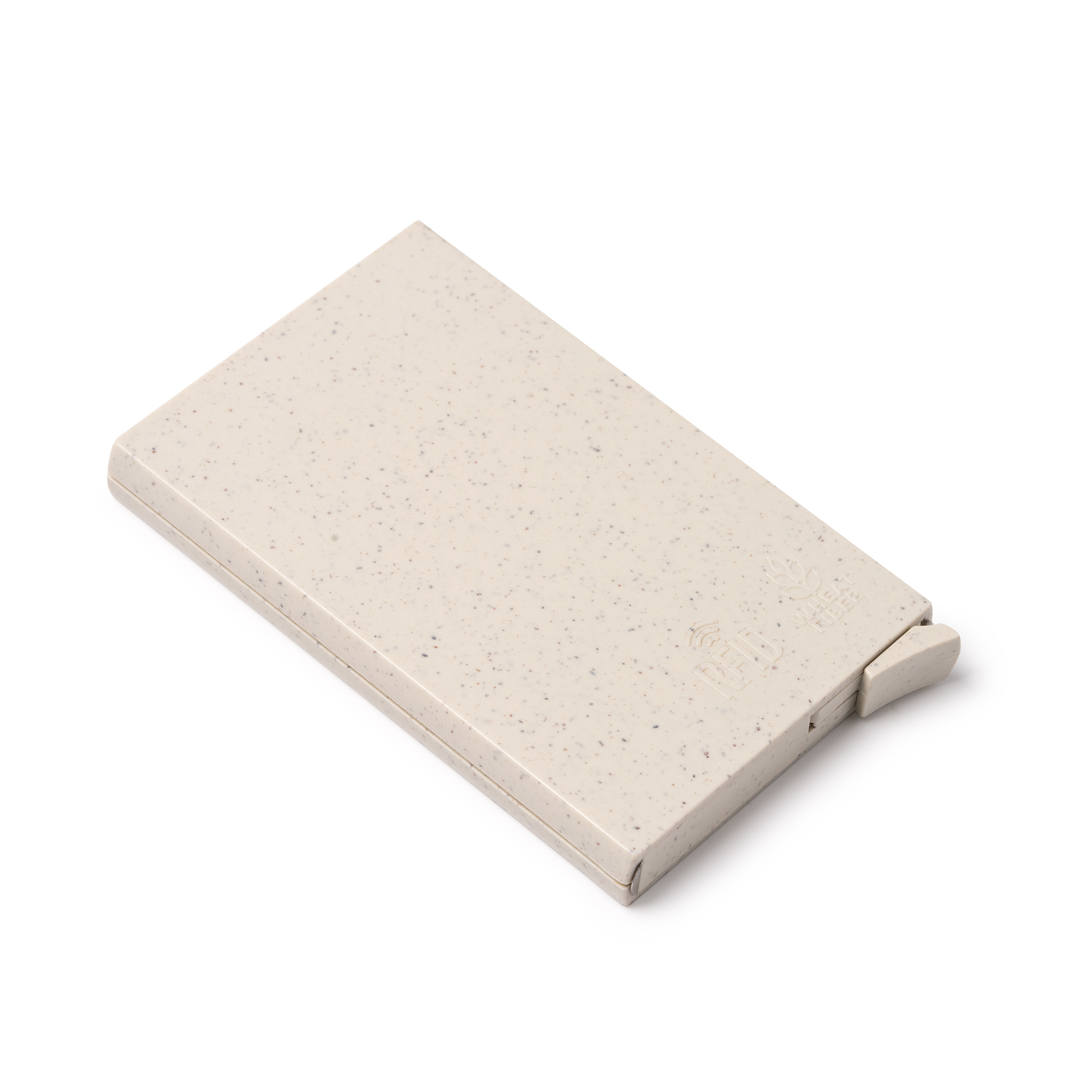 Tarjetero con sistema de seguridad RFID realizado en fibra de trigo. Capacidad hasta 6 tarjetas con mecanismo automático para sacar las tarjetas.