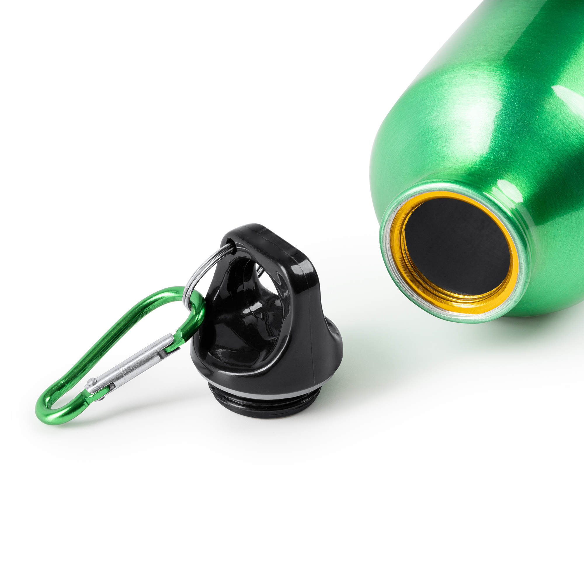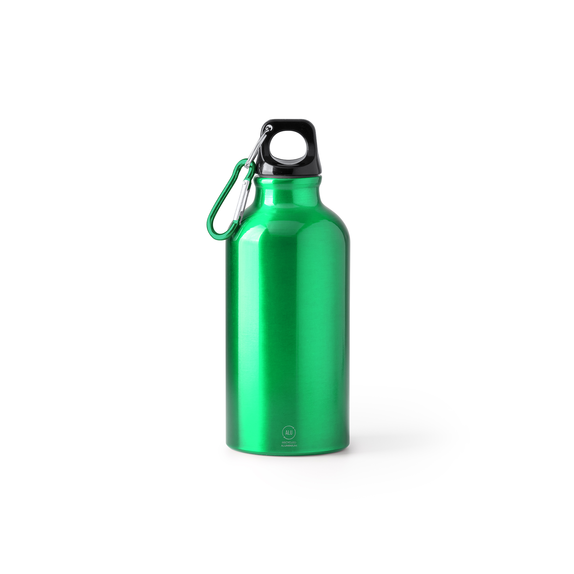 Bidón de aluminio reciclado con pared simple. Capacidad de 400 ml. Tapón negro a rosca con refuerzo de silicona. Además, cuenta con mosquetón a juego, idealmente pensado para el transporte del bidón.