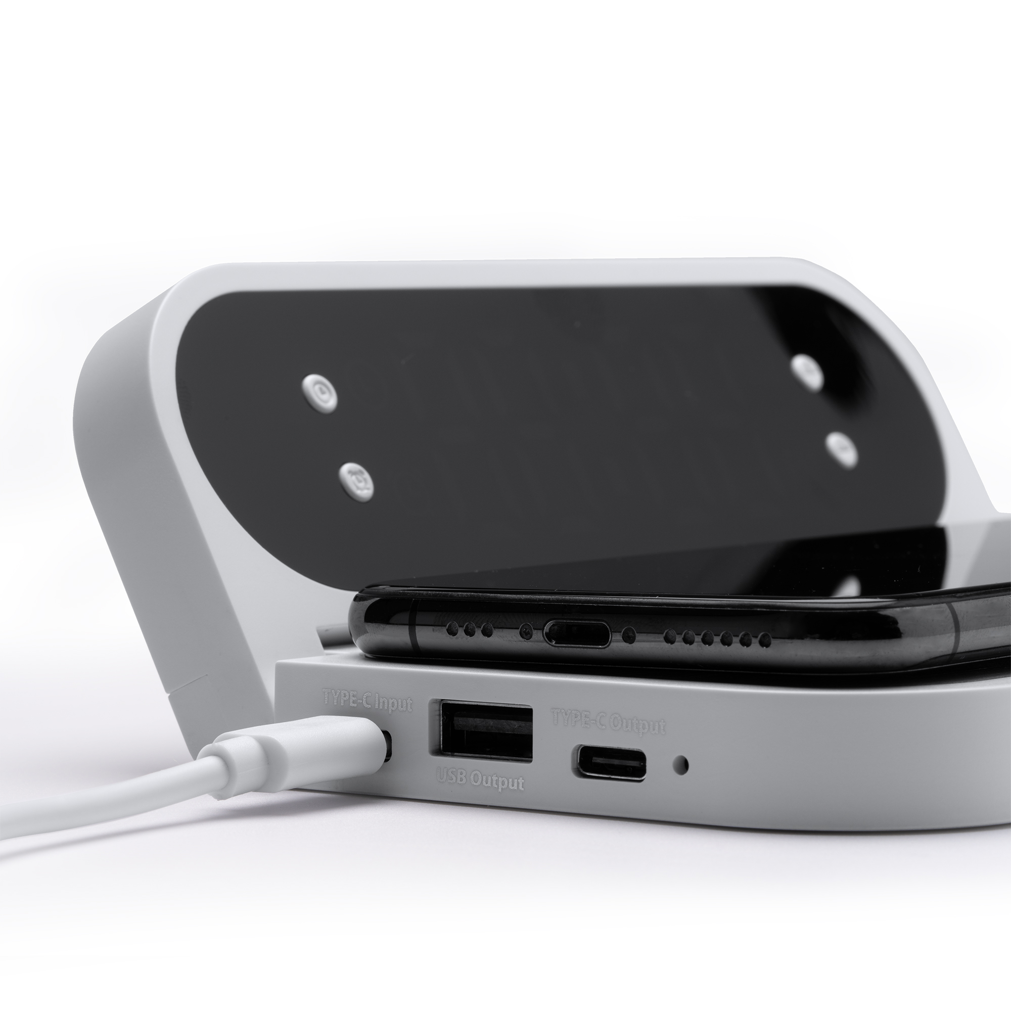 Con potencia de 10W, dos puertos Tipo C de entrada y salida y puerto USB de salida. Con función reloj y alarma, además cuenta con indicador luminoso de carga.