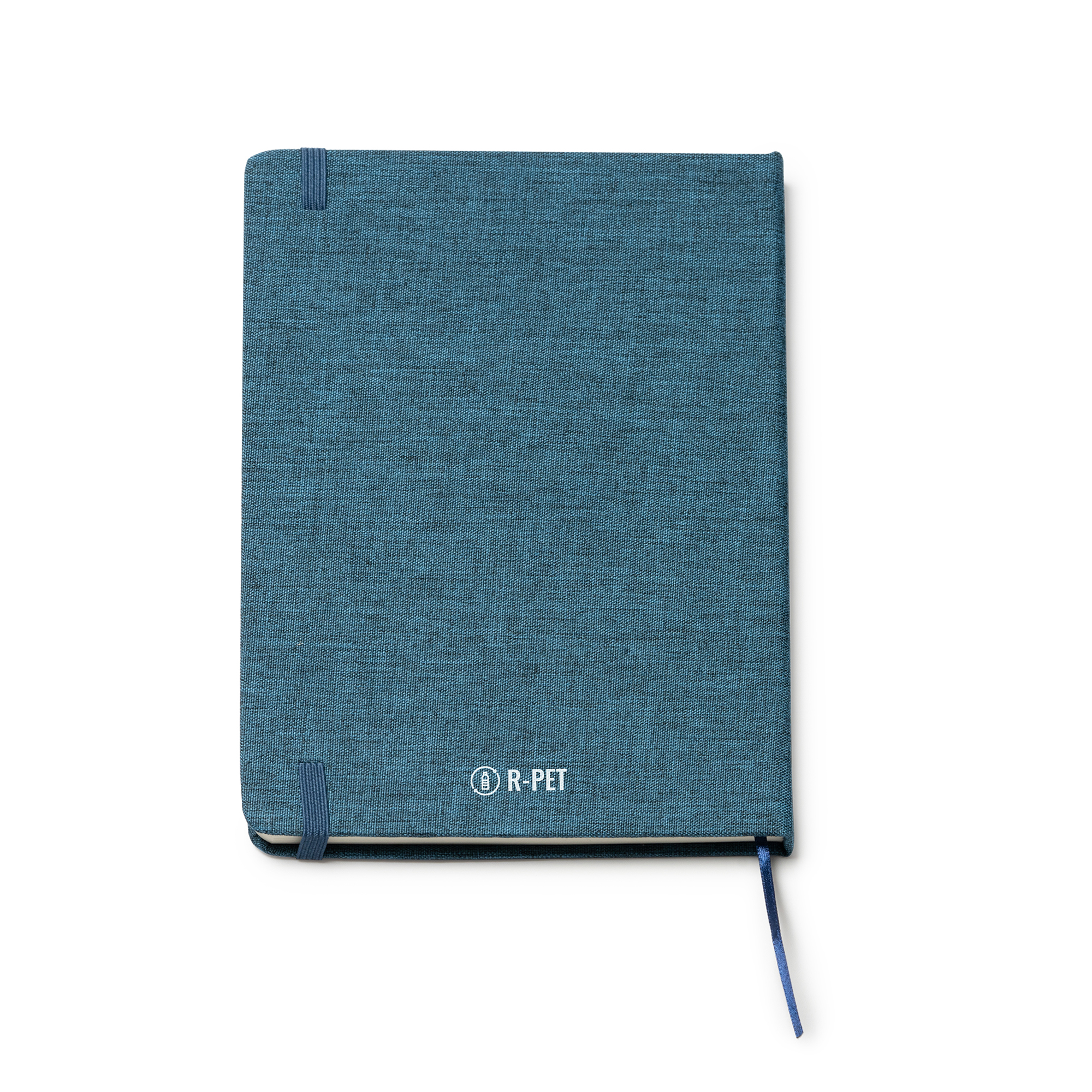 Bloc de notas A5 con tapa rígida de RPET. Marcapáginas y banda elástica a juego. Bloc de notas con 80 hojas lisas.
