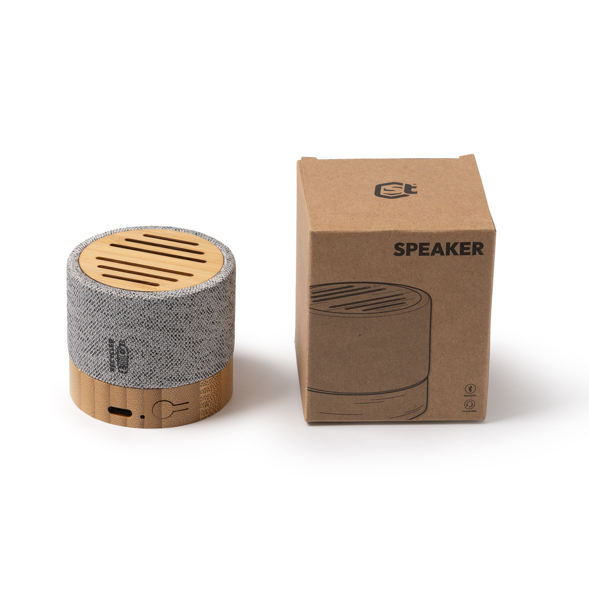 Añadir al rastreador de preciosAltavoz inalámbrico redondo con base y superficie elaboradas en bambú y cuerpo en tejido gris RPET. Con 3W de potencia y batería recargable de litio. Con conexión Tipo C de carga. Cuenta con indicador luminoso de carga. Reproducción de sonido vía Bluetooth. Hasta 4 horas de funcionamiento continuo y hasta 10 metros de distancia de funcionamiento.