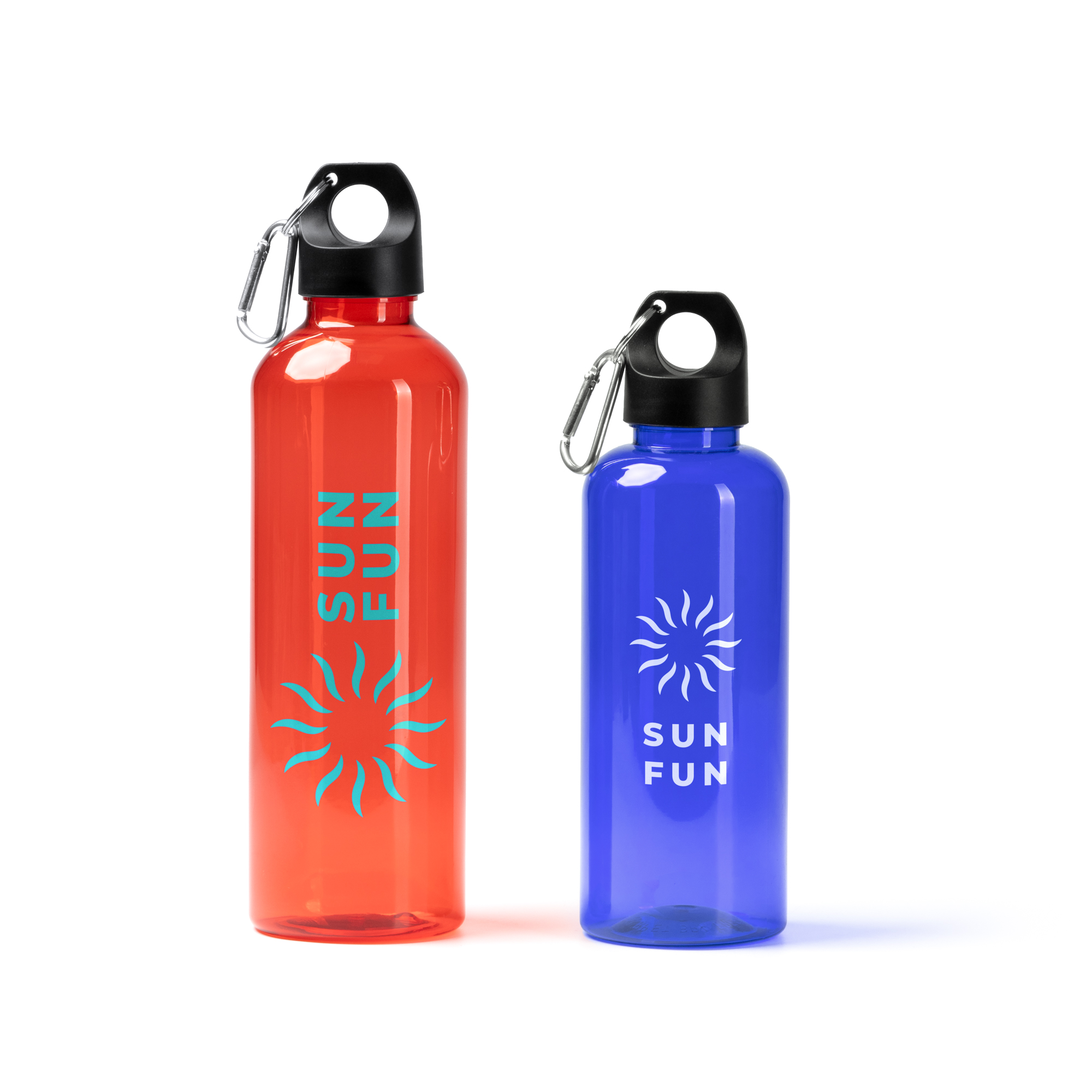 Botella con cuerpo de RPET. T Capacidad 580 ml. Con tapón a rosca con asa de transporte y mosquetón incorporado, facilitando su transporte. Una opción sostenible y respetuosa con el medioambiente a la vez que práctica.