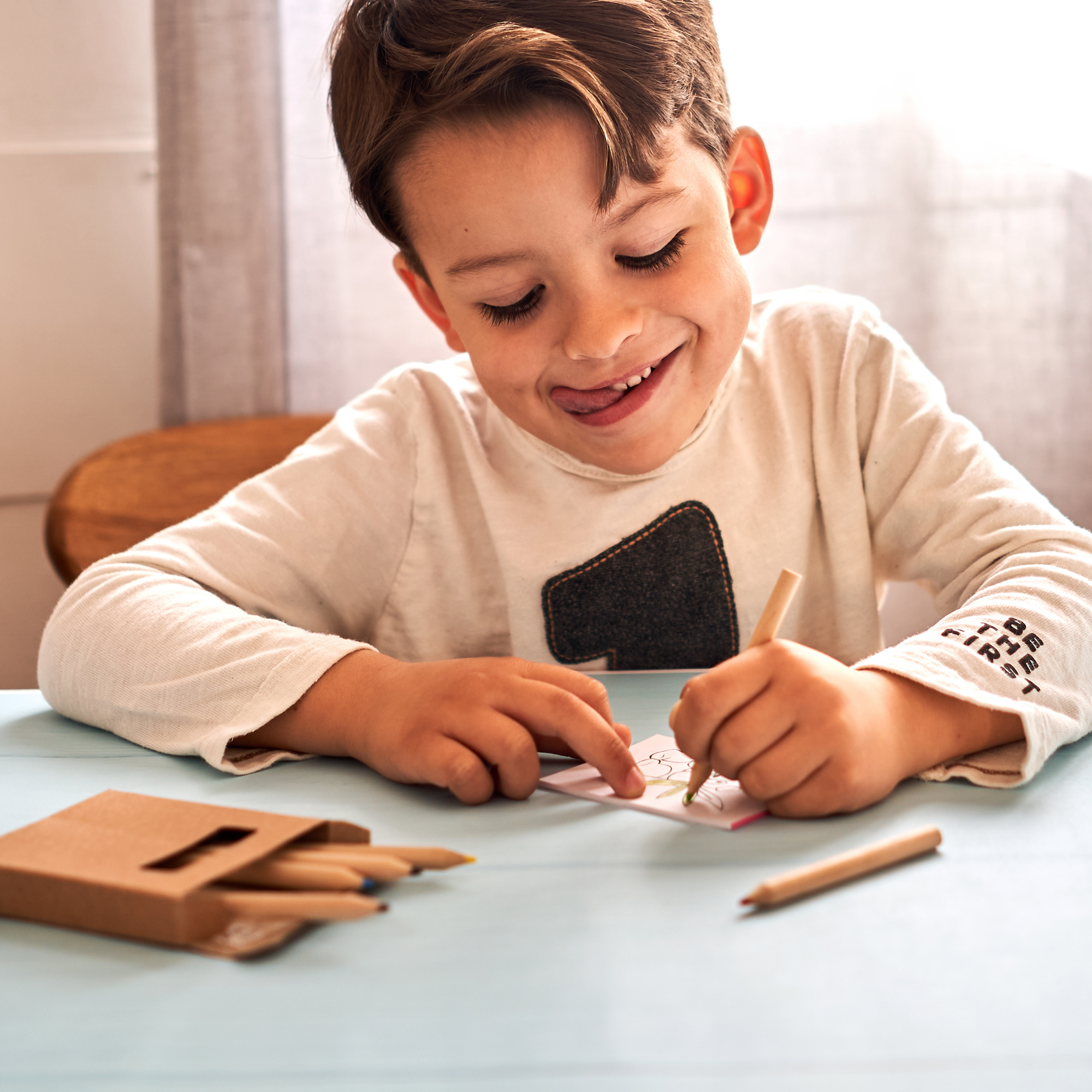 Set infantil para colorear. Incluye bloc con 20 hojas con dibujos variados, 6 lápices de colores y sacapuntas.