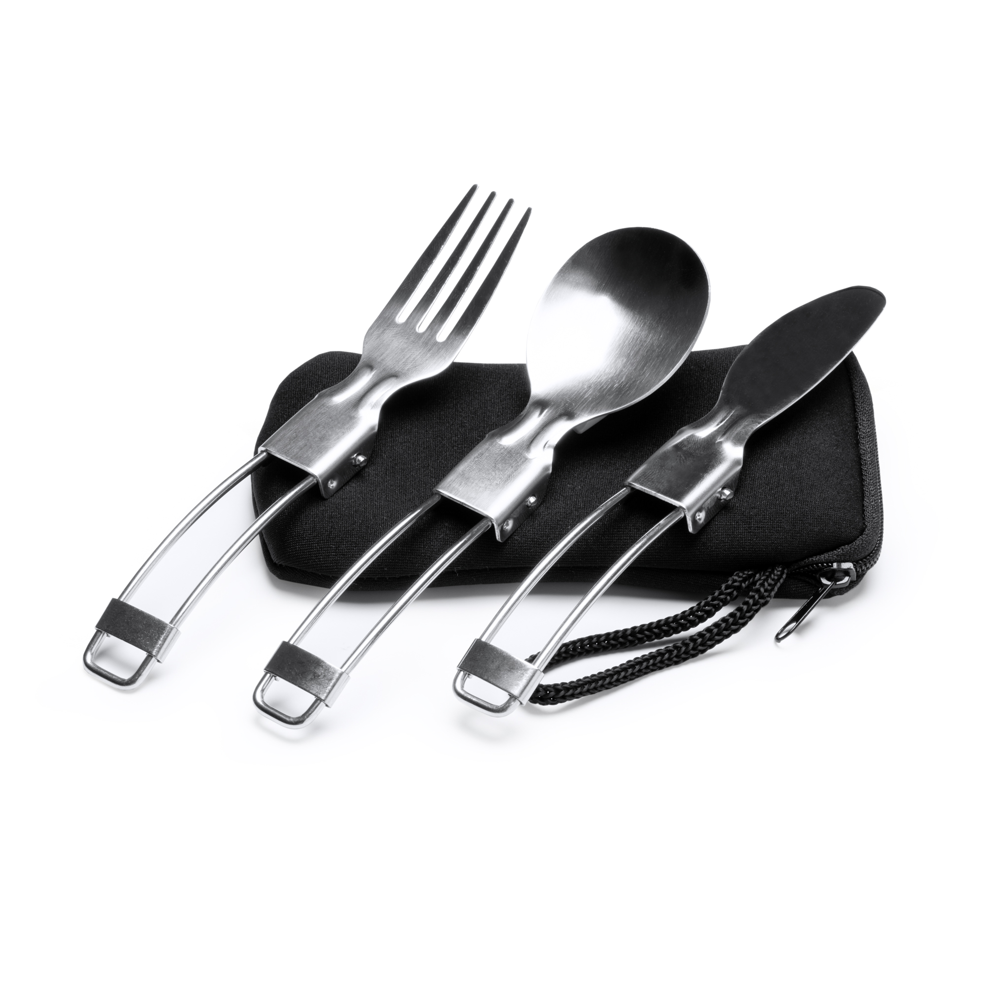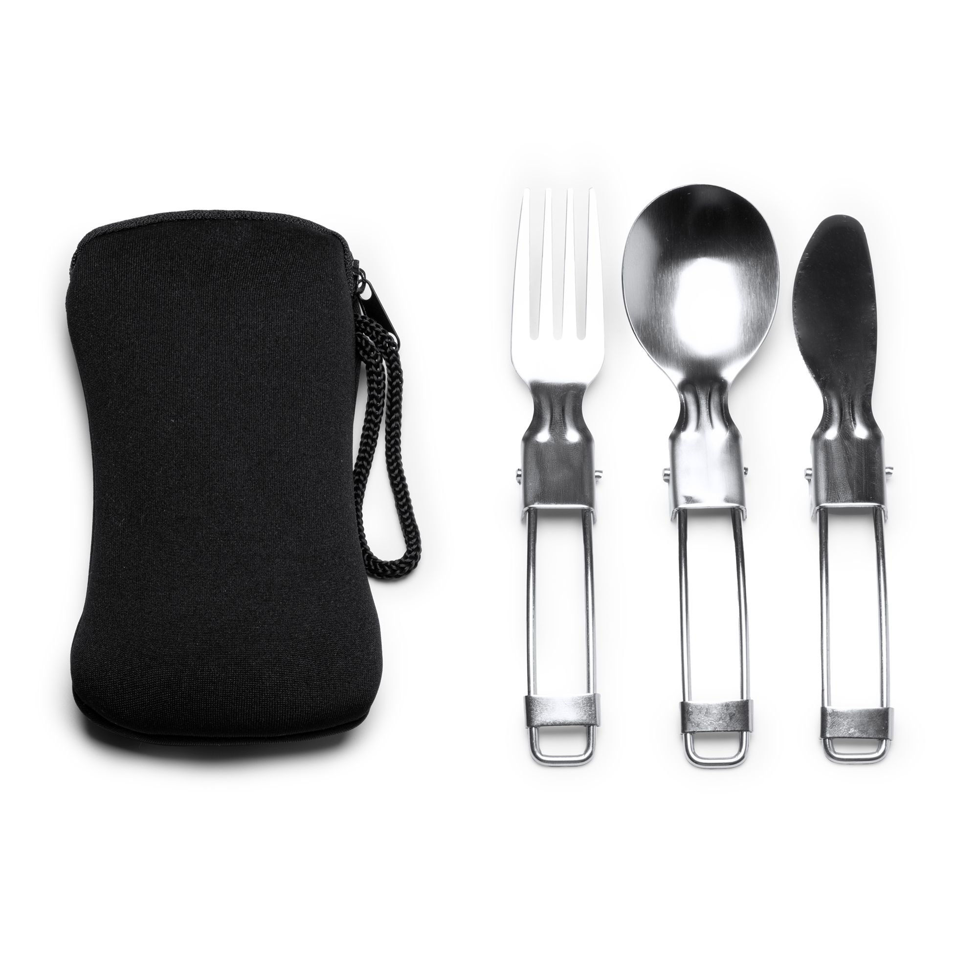 Set de cubiertos plegables de acero inoxidable con práctica funda de neopreno con cierre de cremallera y con asa para transporte. Incluye tenedor, cuchillo y cuchara.