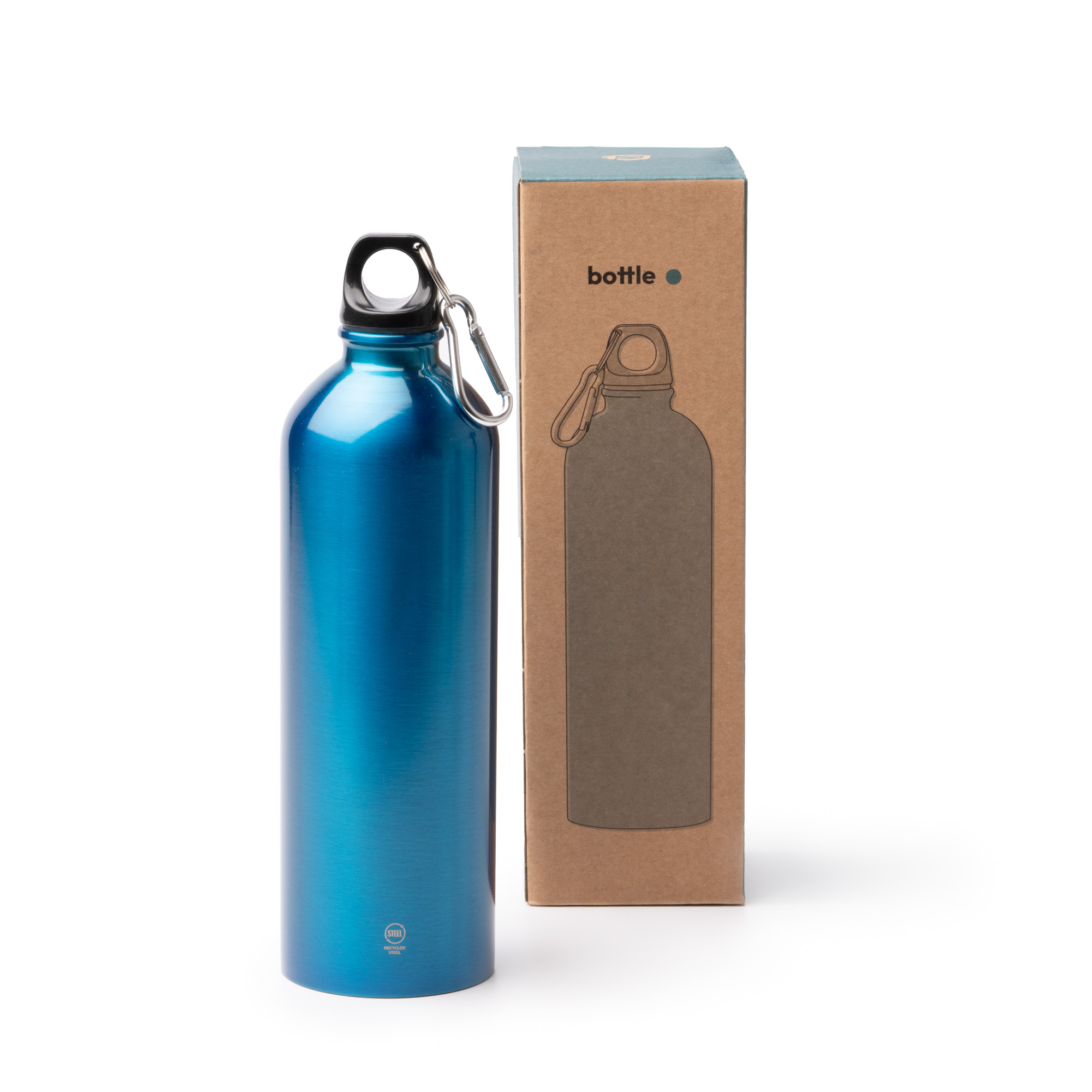 Bidón de acero inoxidable 304 reciclado. Con capacidad para 750 ml y acabado metalizado. Cuenta con tapón a rosca con silicona para evitar el goteo de las bebidas. Incorpora también un mosquetón en el tapón para hacer más fácil su transporte.