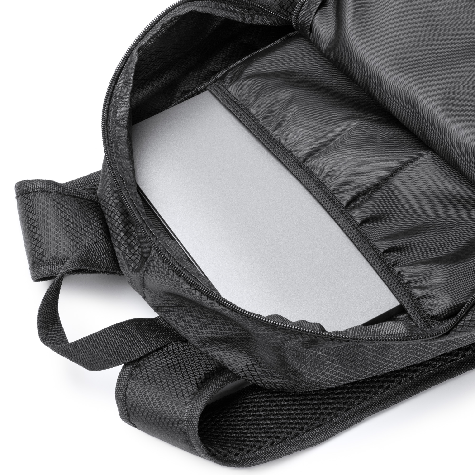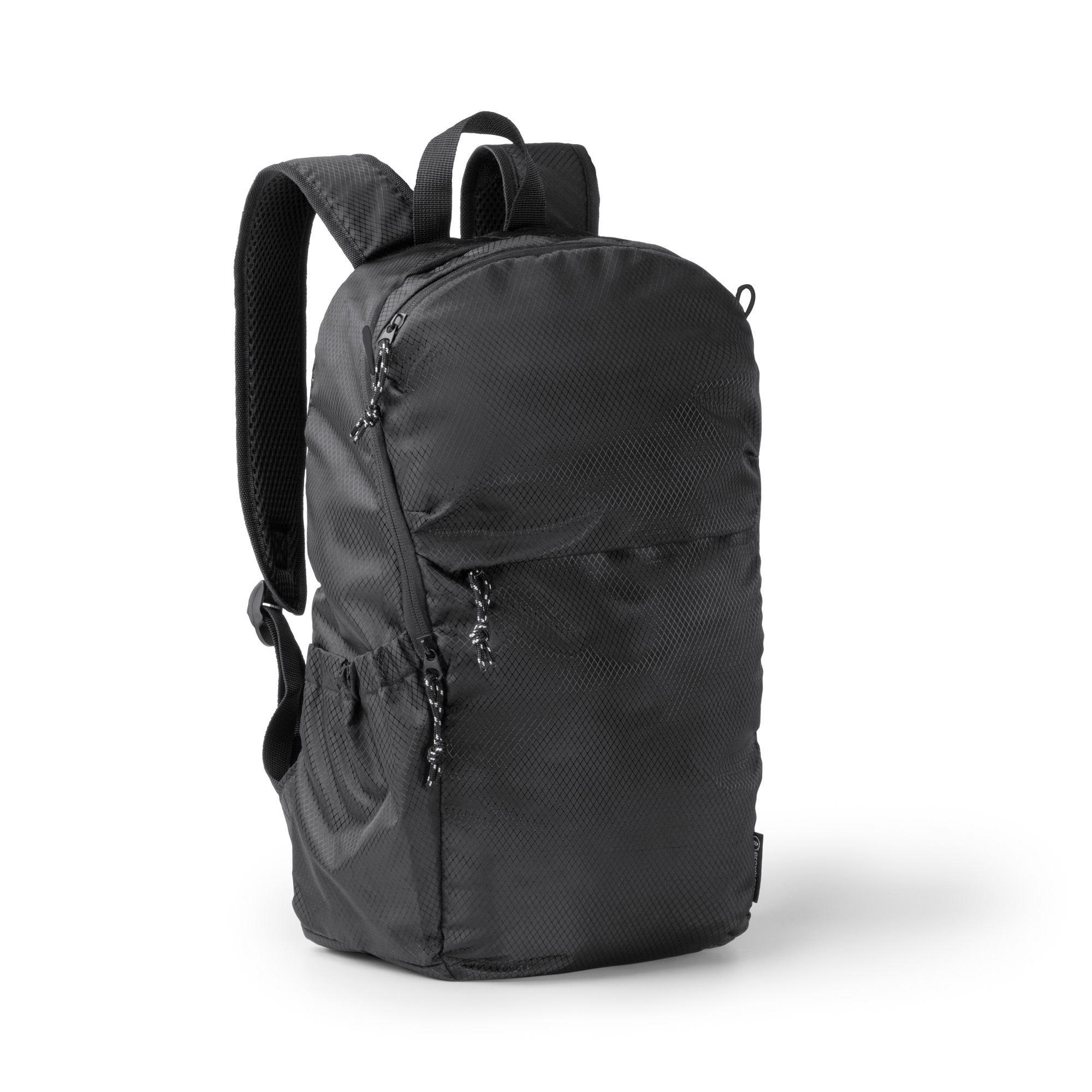 Mochila elaborada en Ripstop RPET, tejido repelente al agua. Dispone de un compartimento principal con cierre de cremallera y un bolsillo interior con ajuste elástico para trasladar dispositivos electrónicos de hasta 9″ , dos compartimentos frontales exteriores con cierre de cremallera también. Además, incorpora un compartimento lateral con ajuste elástico para el transporte de otros enseres como botellas o bidones. Gracias a sus asas y espalda acolchadas, su transporte se hace más cómo y ligero.