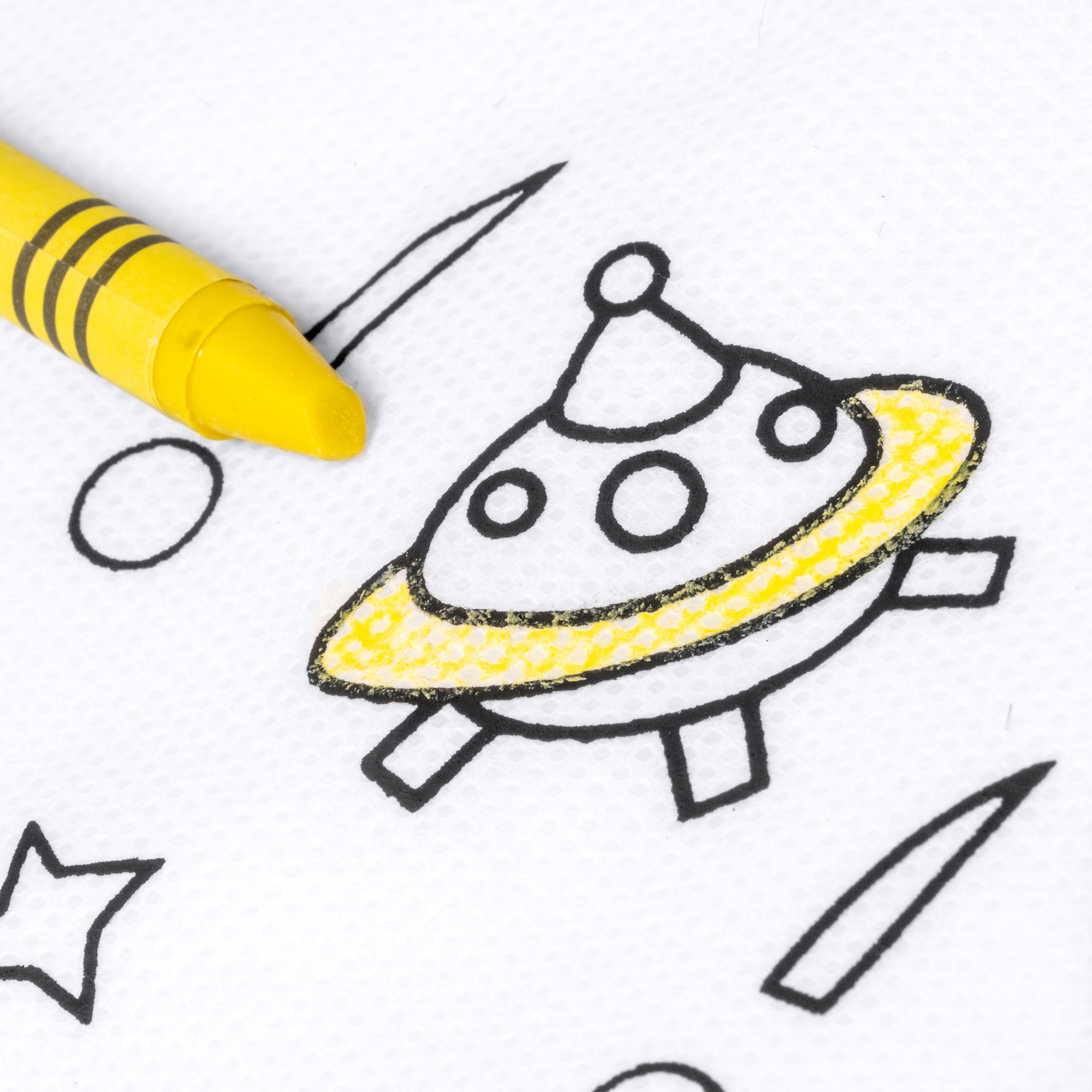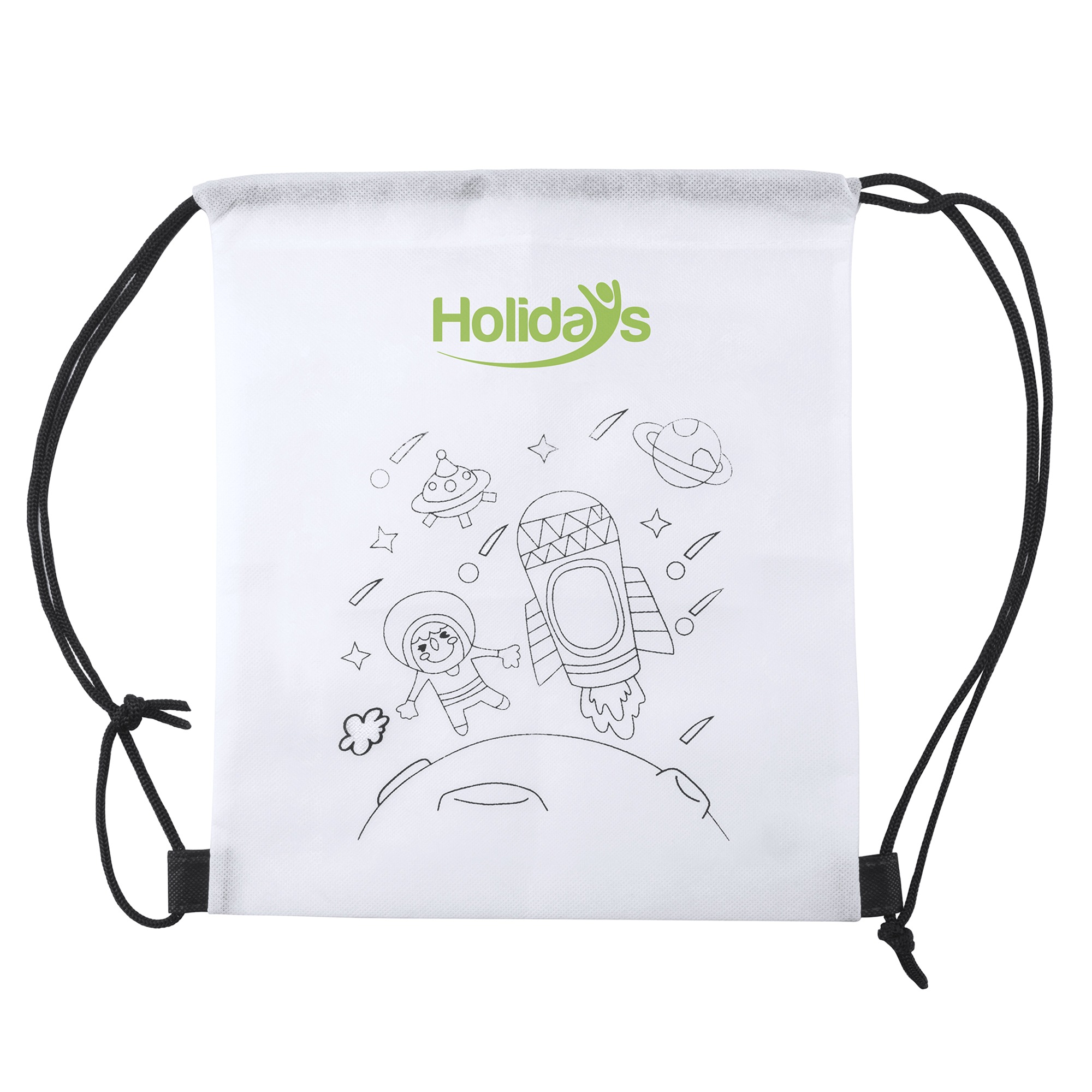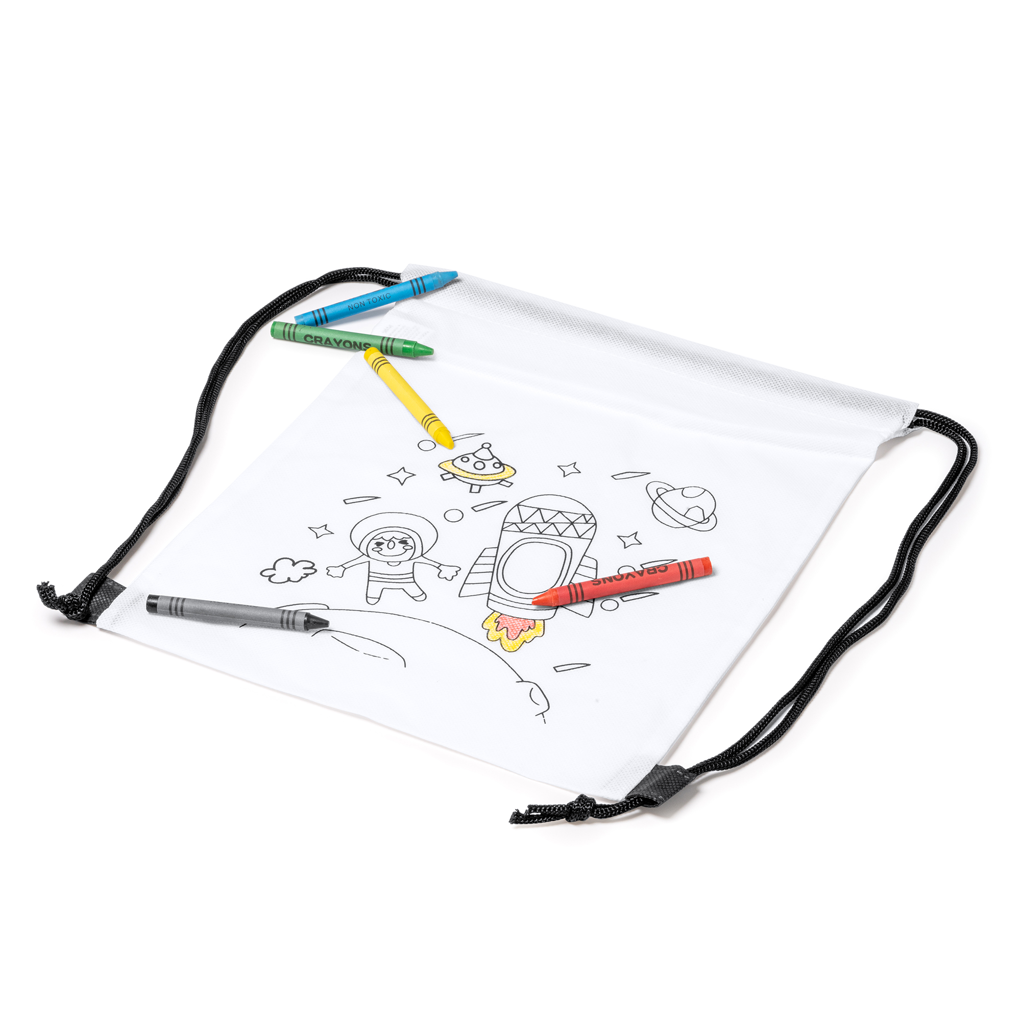 Mochila infantil de cuerdas realizada en non-woven, con diseño para colorear. Incluye 5 ceras en colores variados.