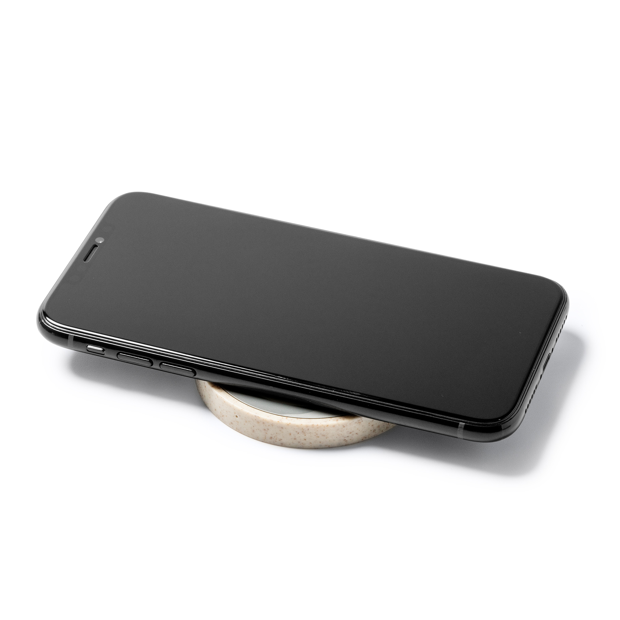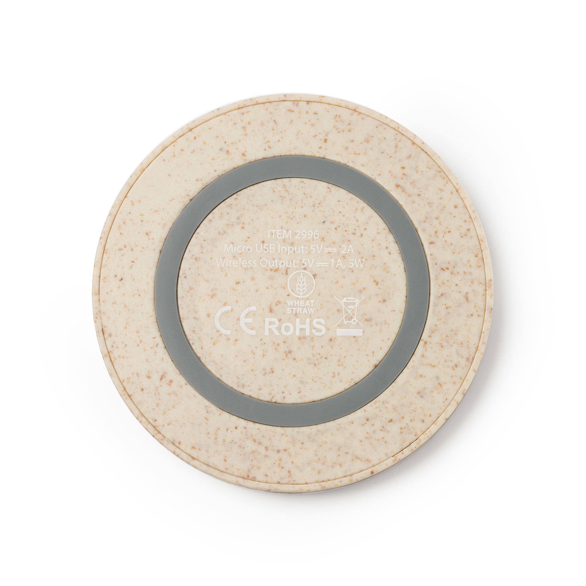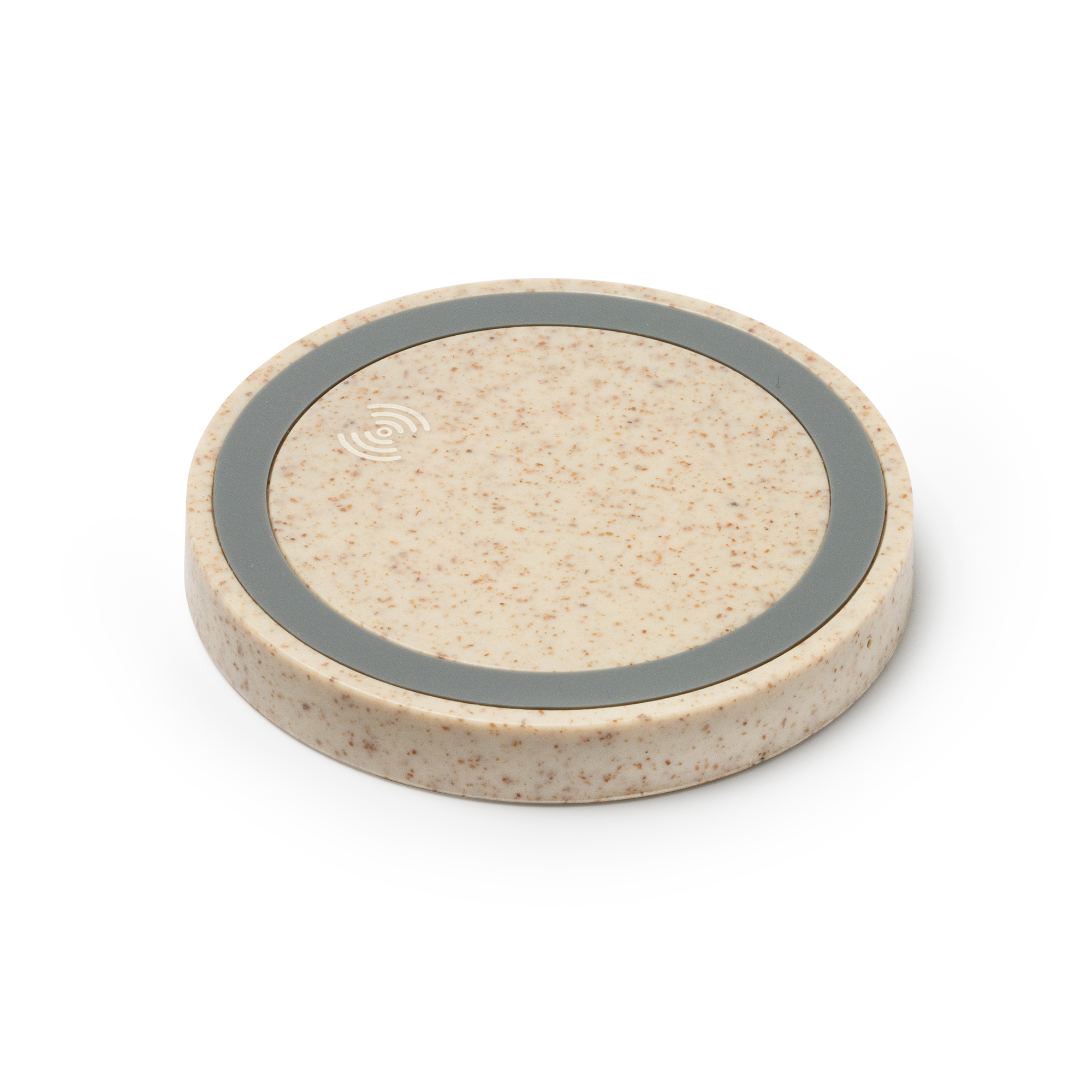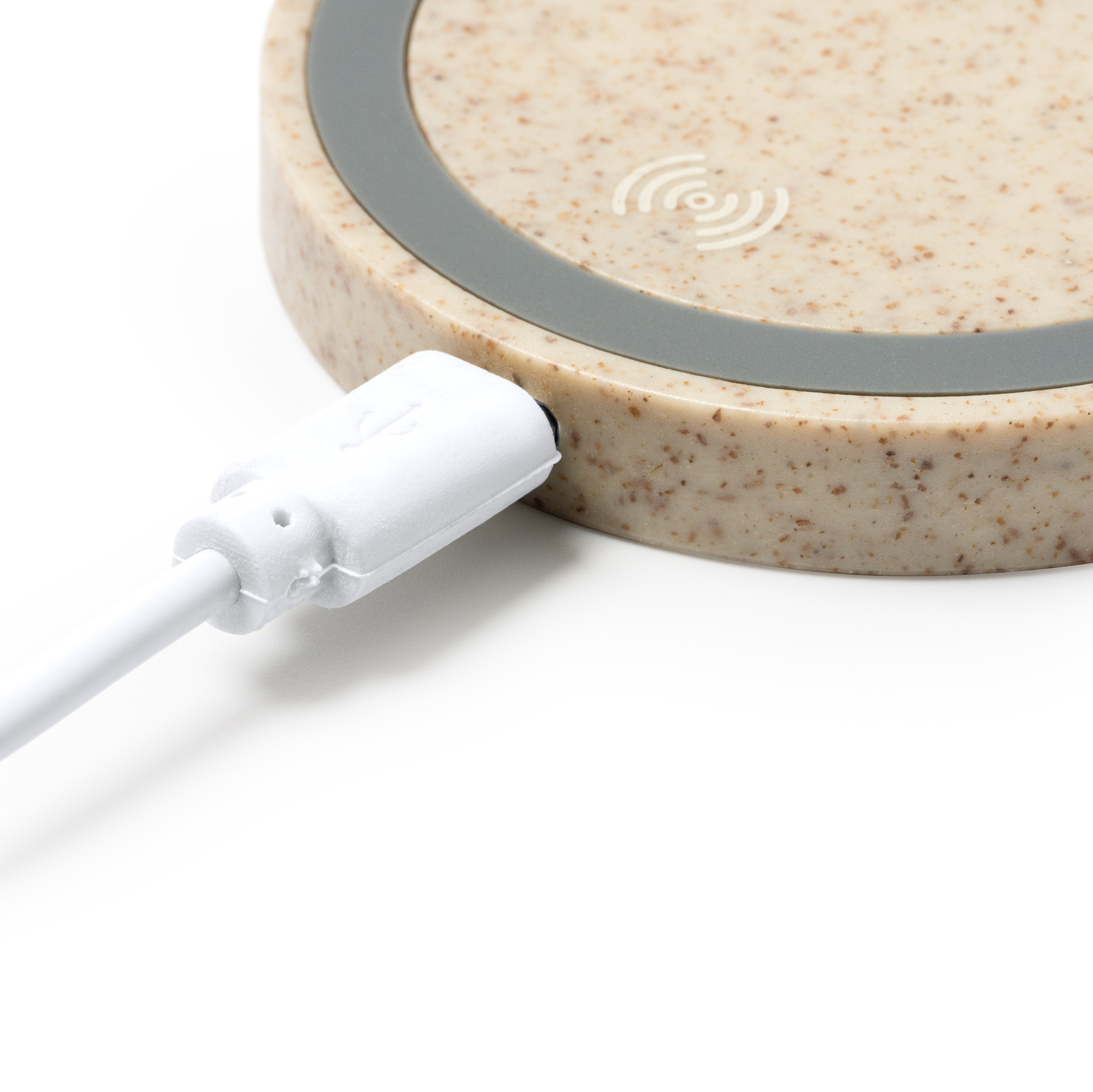 Base de carga inalámbrica con cuerpo elaborado en fibra de trigo. Con 5W de potencia. Cuenta con anillo antideslizante en la superficie. Compatible con dispositivos provistos de tecnología de carga inalámbrica. Cable extraíble incluido.