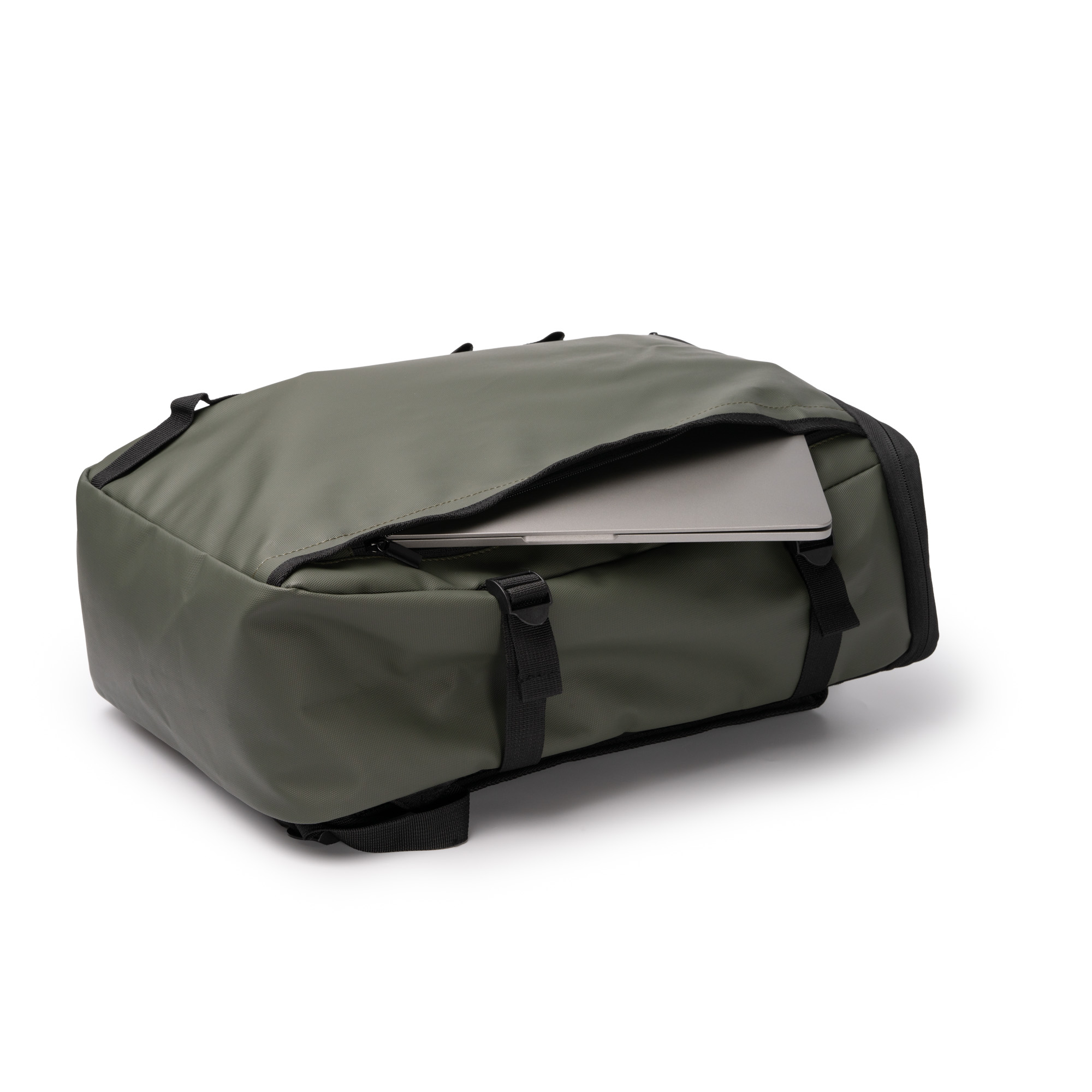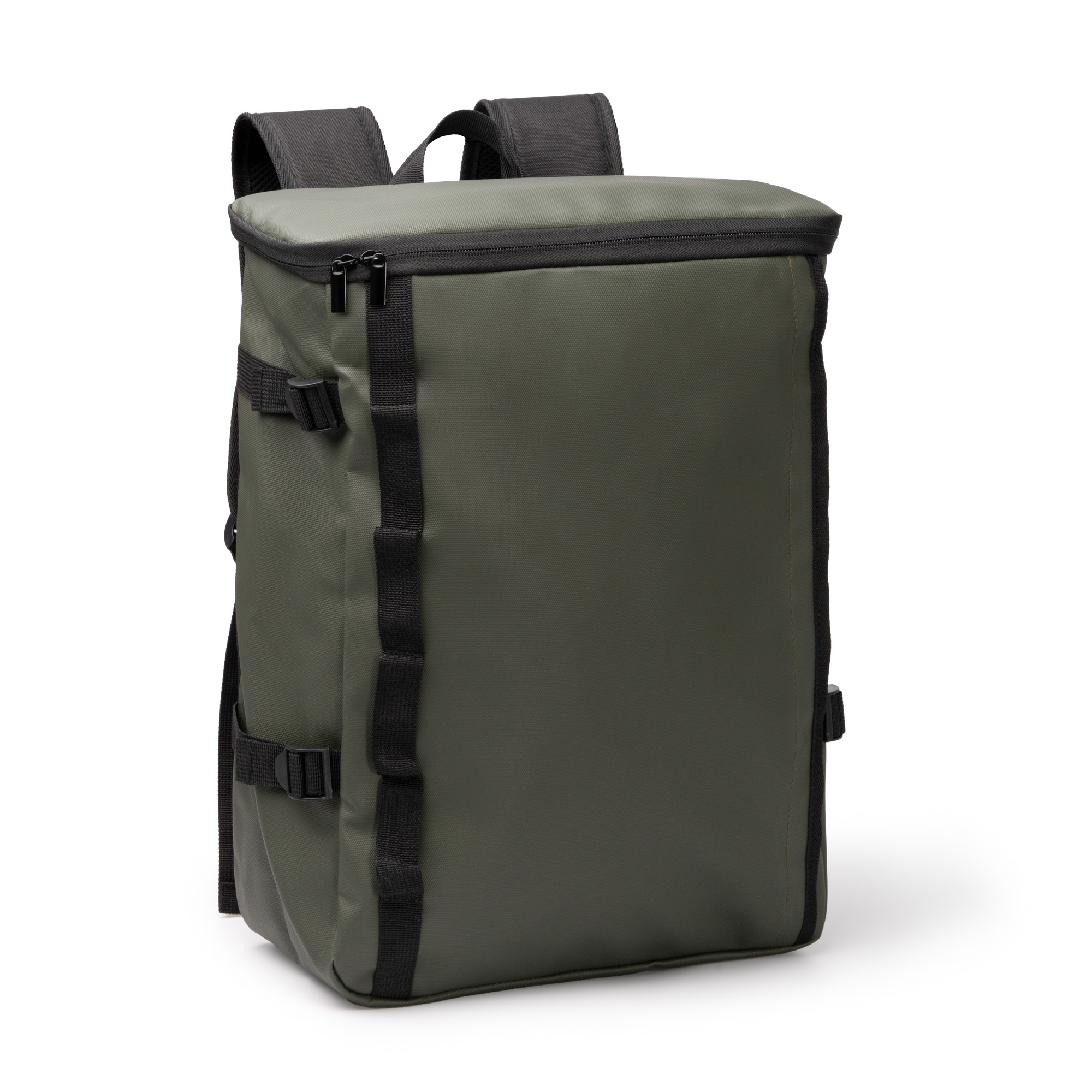 Mochila elaborada en PU Leather y poliéster 600D con un gran compartimento principal forrado en su parte superior, cierre de cremallera y un un bolsillo interno con ajuste elástico para el transporte de un ordenador portátil de hasta 16″. Cuenta con un bolsillo invisible exterior en su parte frontal, además de seis puntos de anclaje en el lateral. Sus cintas laterales de ajuste permiten adaptar la mochila a su contenido y la cinta para Trolley la convierten en una opción cómoda y versátil en su uso. Espalda y asas van acolchadas.