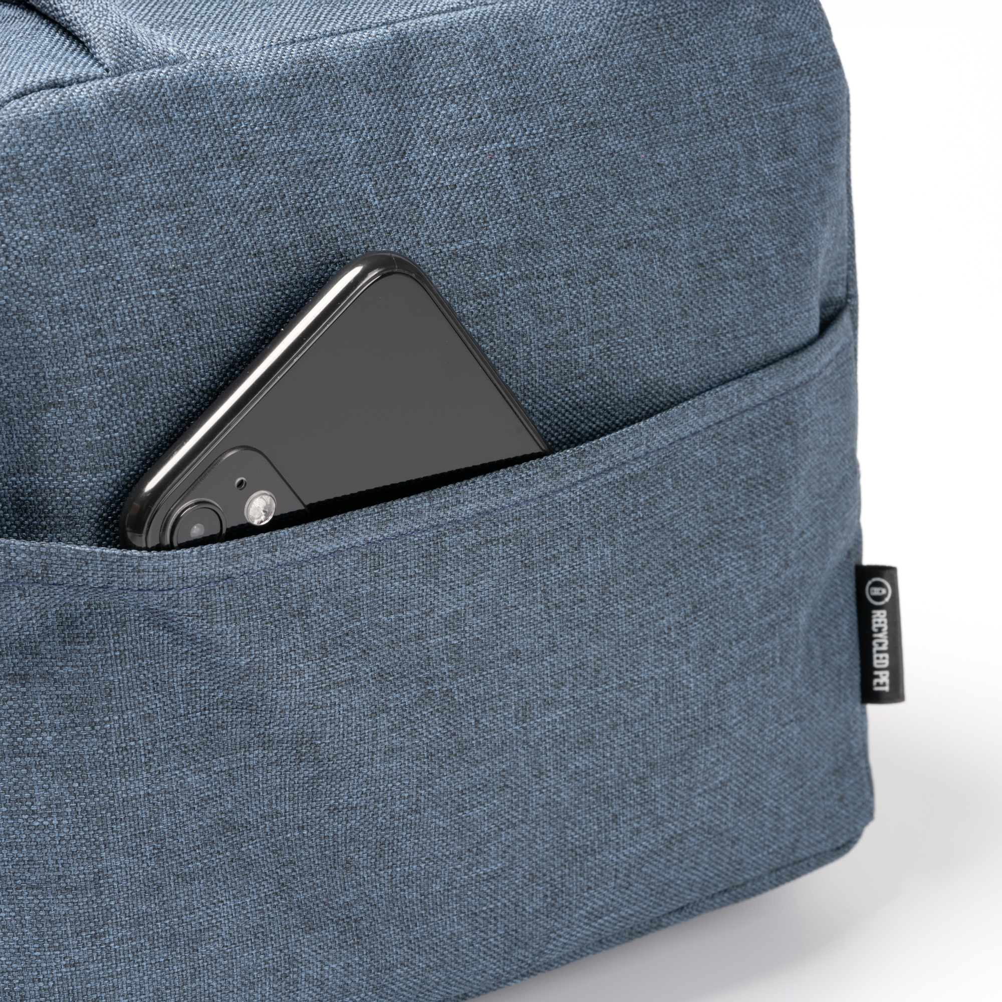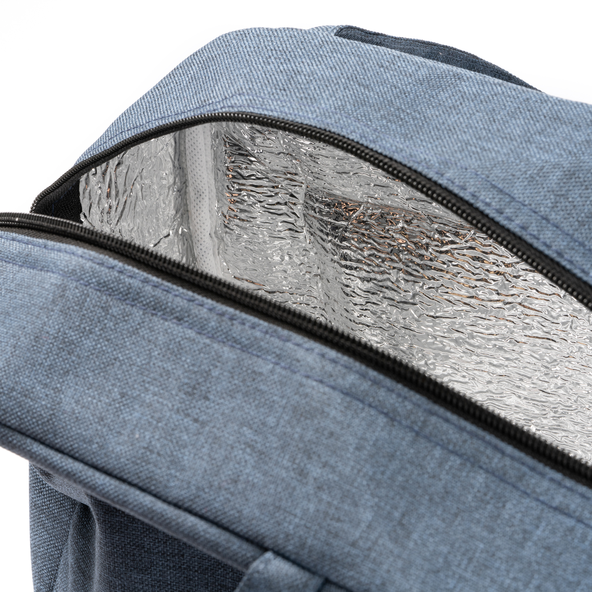 Nevera realizada en 600D RPET con un compartimento principal con interior isotérmico para el almacenaje de bebidas y alimentos a la temperatura óptima. Cuenta, además, con un bolsillo frontal para el almacenaje de utensilios y pequeños snaks, además de asas redondas acolchadas para mayor versatilidad en su transporte.