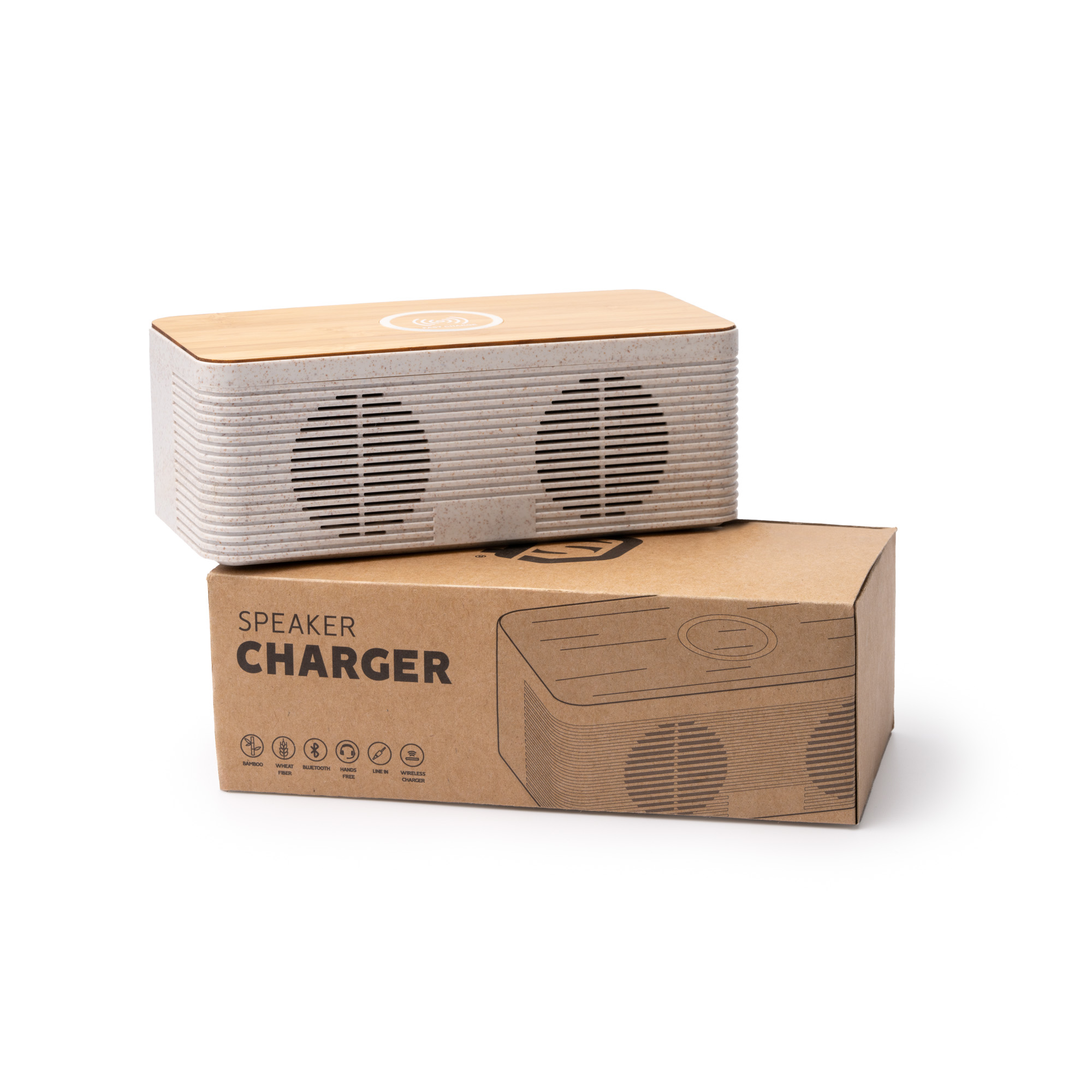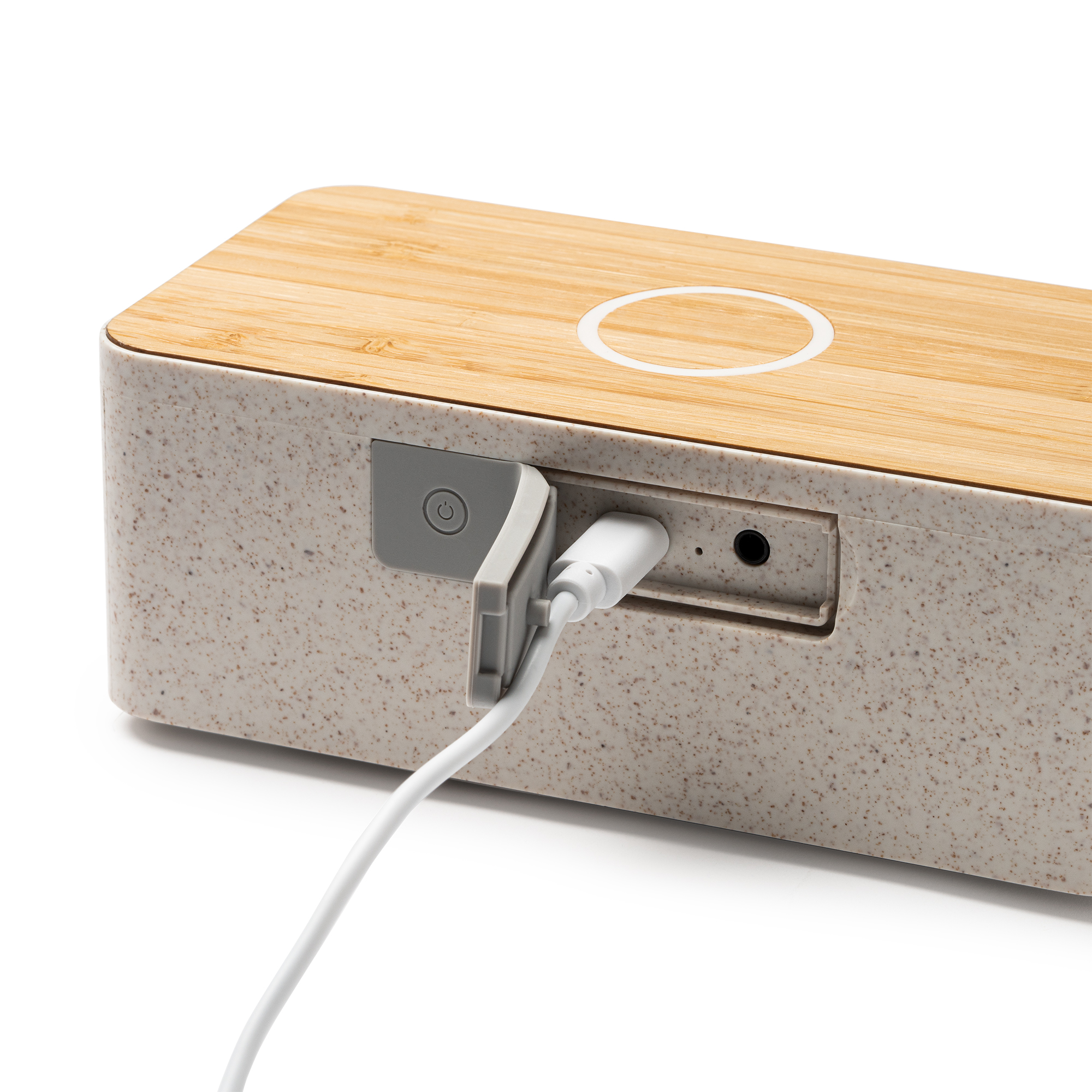 Añadir al rastreador de preciosAltavoz inalámbrico con cuerpo elaborado en fibra de trigo y superficie en bambú. Con 5W de potencia y conexión Bluetooth. Distancia máxima de funcionamiento del altavoz de hasta 5 horas. Cuenta con función de carga inalámbrica en la superficie con 10W para recarga de dispositivos provistos de esta tecnología. Con indicador luminoso, puerto de entrada Mini Jack para salida de audio en modo auxiliar y botón encendido/apagado multifunción.